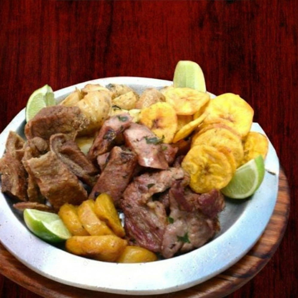 Picada x2: trozos de bondiola, chorizo, chicharron, papa artesanal, maduro, moneditas de platano, limon
