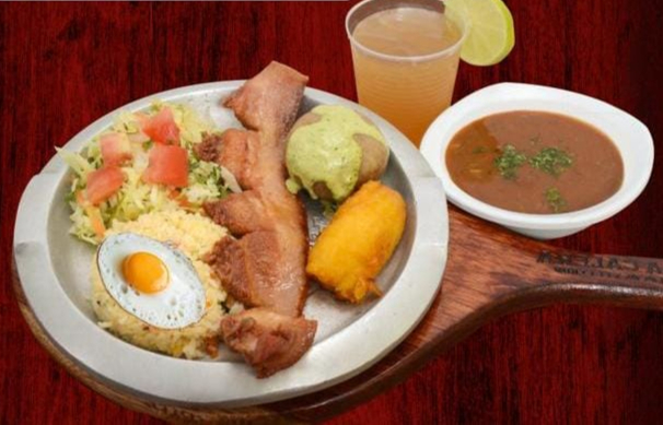 Frijoles, chicharron, huevo, arroz, carne molida de cerdo, chorizo, papa cocida, maduro, ensalada + agua de panela con limón