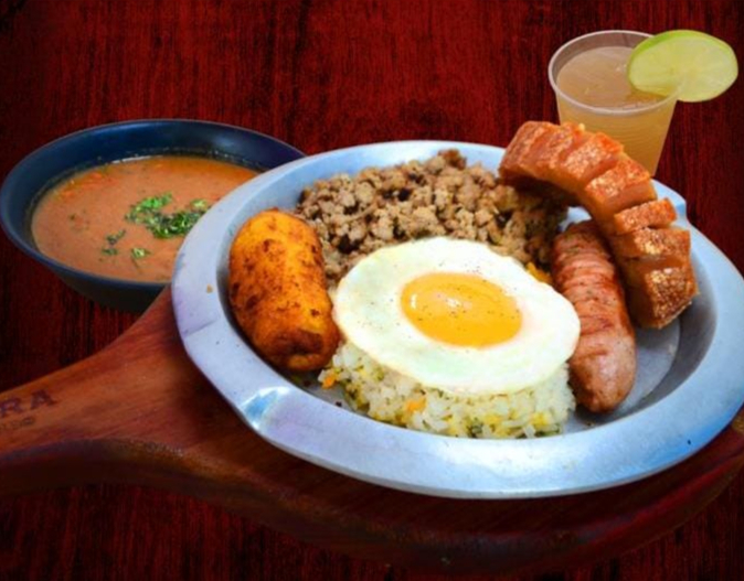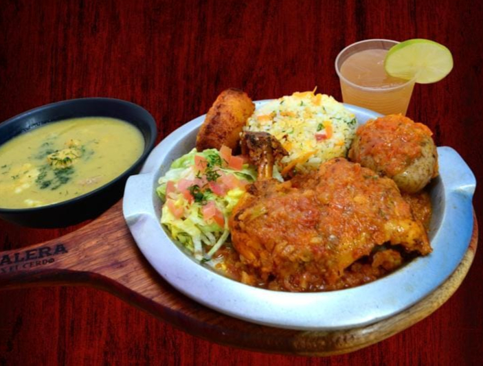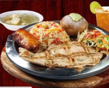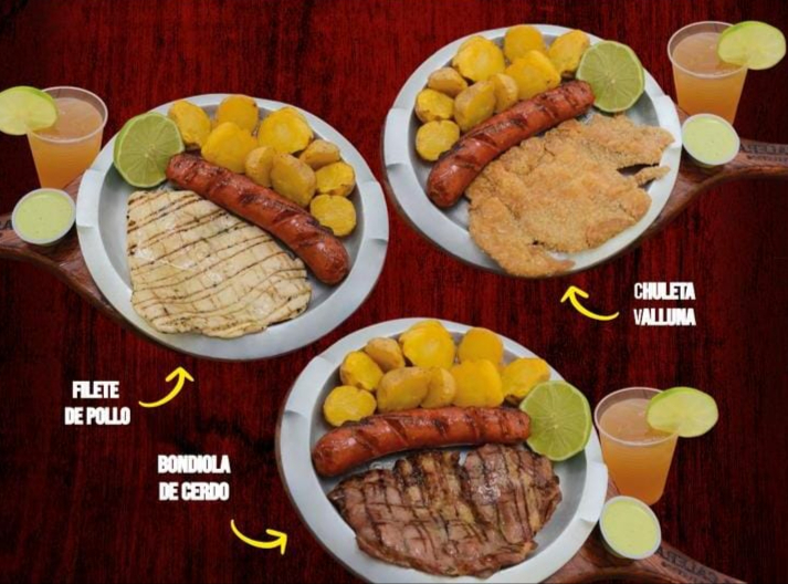 Proteína a elección acompañado con chorizo artesanal de cerdo, papá amarilla artesanal, arroz, ensalada + sopa del día o frijoles, + agua panela con limón.