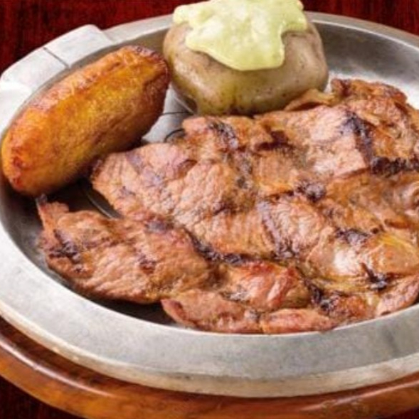 Carne a la parrilla de cerdo ahumado 2 unds de 200gr cada uno con papa cocida, plátano maduro guayabo y ensalada