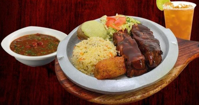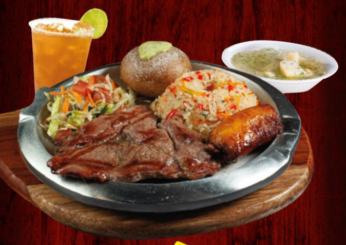 Proteina entre costilla BBQ o filete de res a la parrilla, acompañado con arroz, papa cocida, maduro, ensalada + sopa del dia o frijol + agua de panela con limón