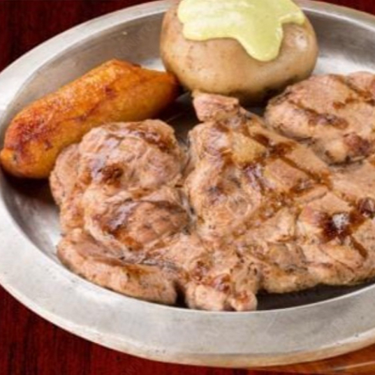 Bondiola de cerdo 2 unds de 200gr c/u, con papa cocida, plátano maduro guayabo y ensalada.