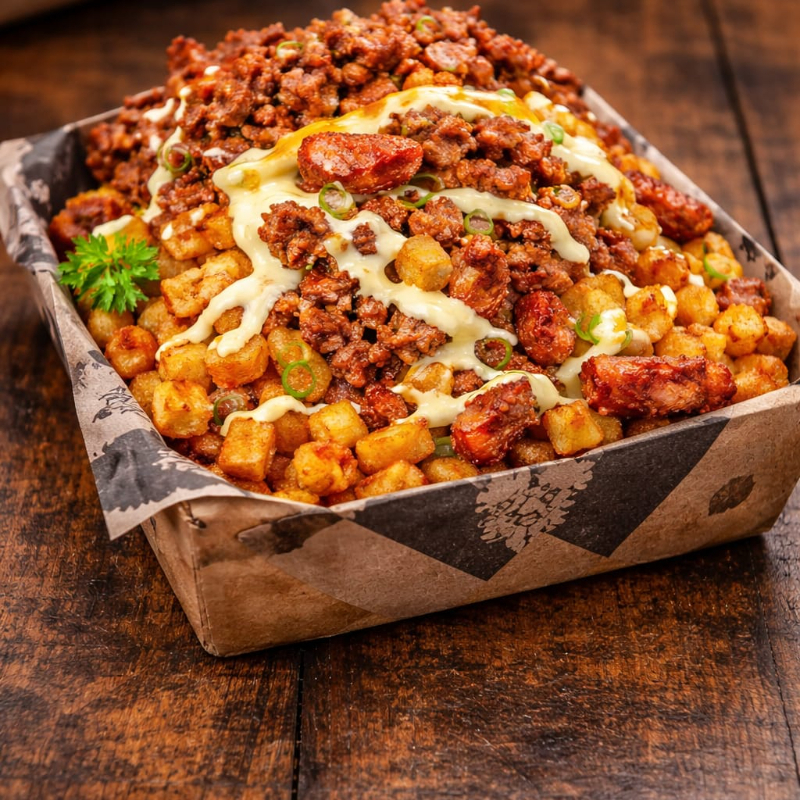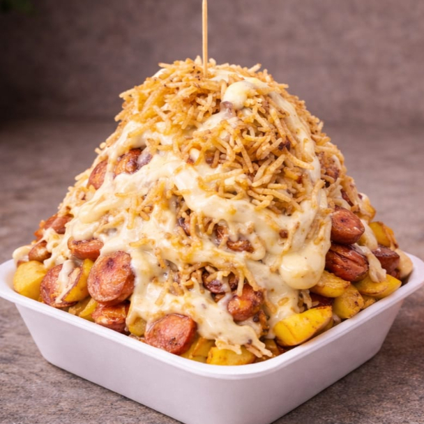 Papa amarilla, salchicha, carne y pollo(adobado en guiso y salsas), maduro, maicito, ripio, cebolla caramelizada salsa de la casa.