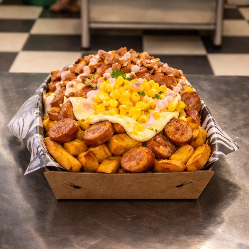 papa amarilla, salchicha, ripio, maicitos, maduro, cebolla caramelizada, tocineta y salsas de la casa
