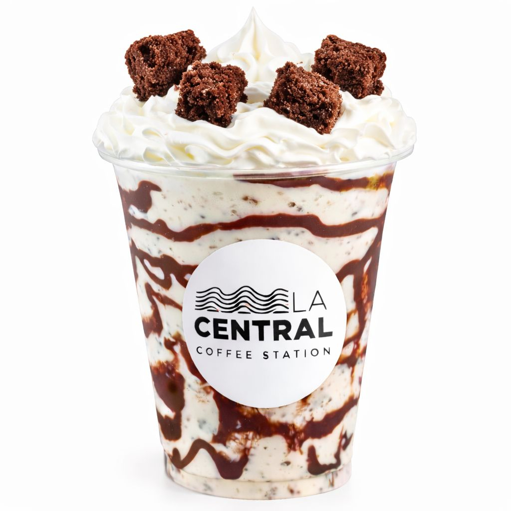 Deliciosa malteada acompañada de trozos de brownie y salsa de chocolate.