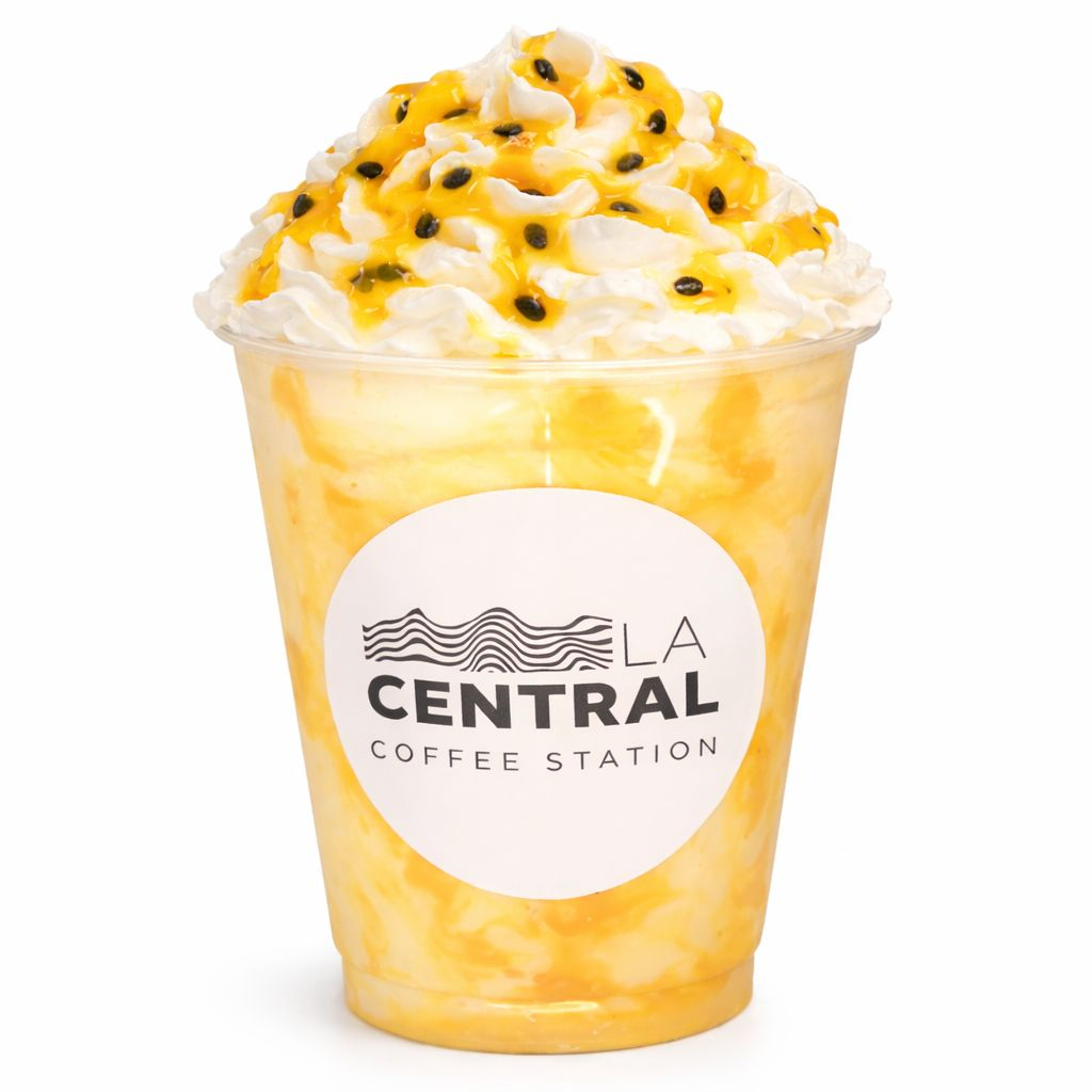 Deliciosa malteada acompañada de maracuyá, salsa de maracuyá.