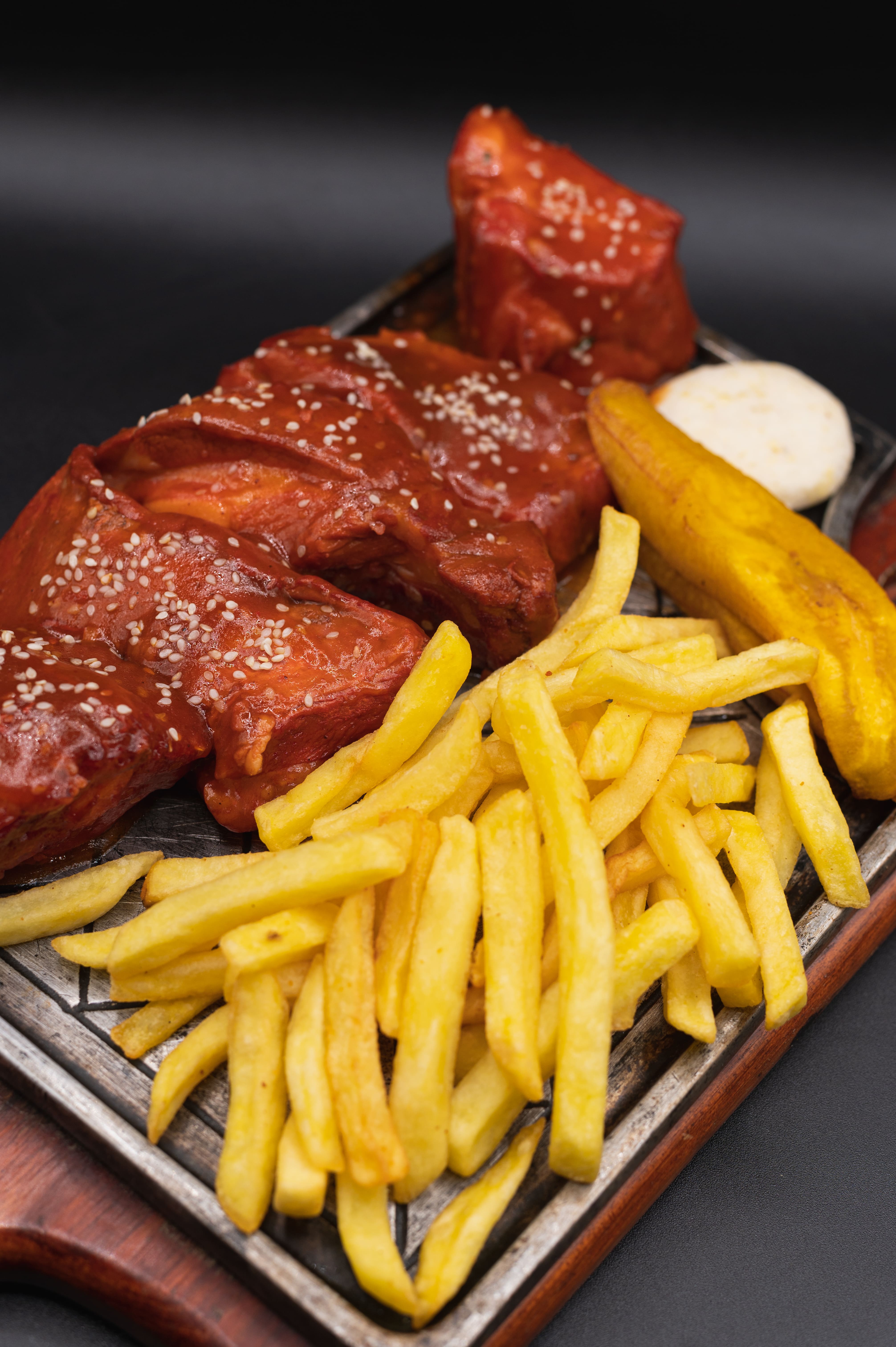 Costillas a la BBQ o al horno 200 g acompañada de arroz o papas a la francesa, ensalada, frijoles como principio más agua panela.
