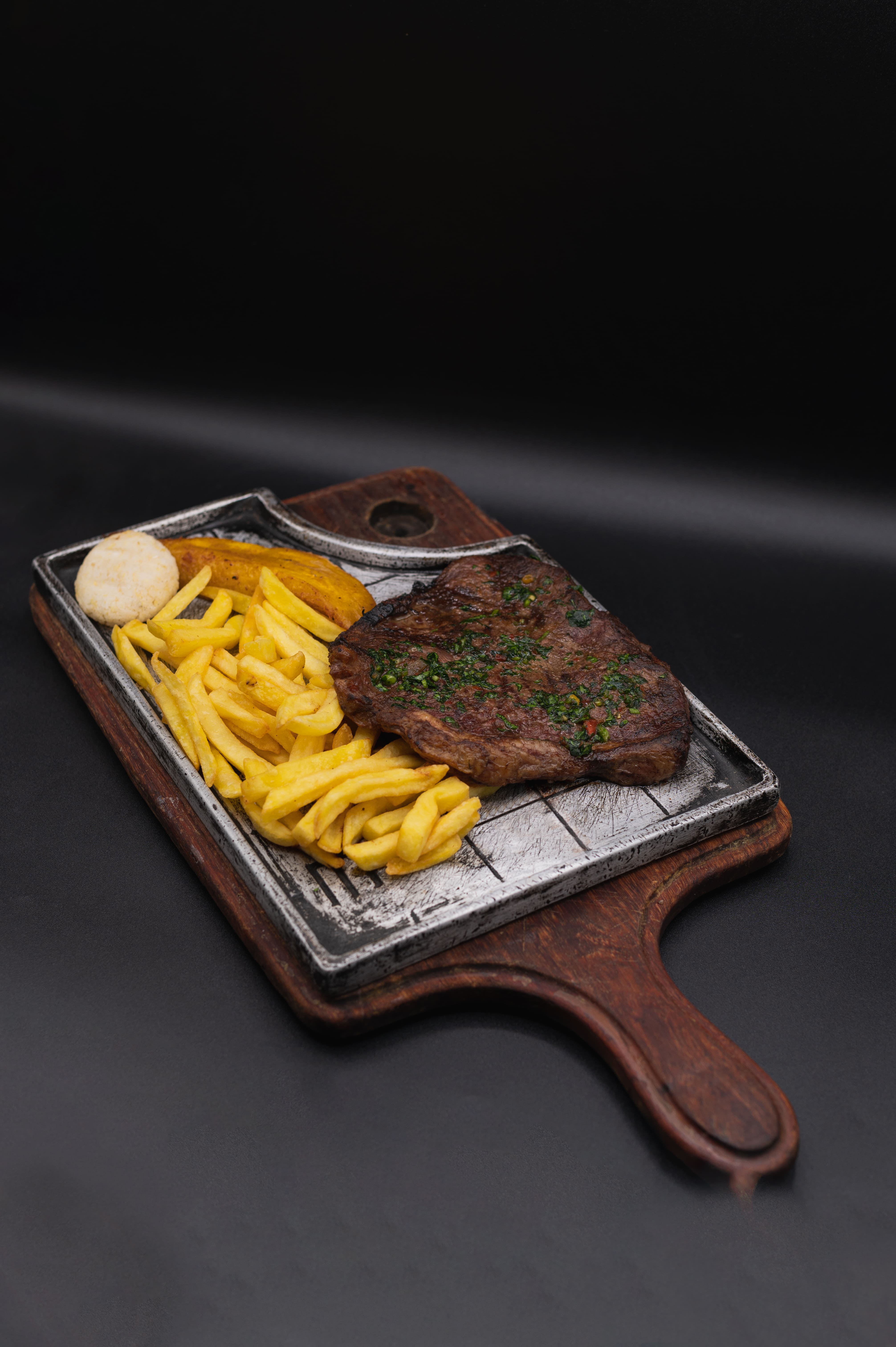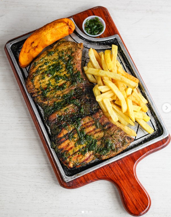 Carne asada 200 g acompañada de papas a la francesa o arroz, ensalada, maduro, arepa y frijoles como principio más agua de panela.