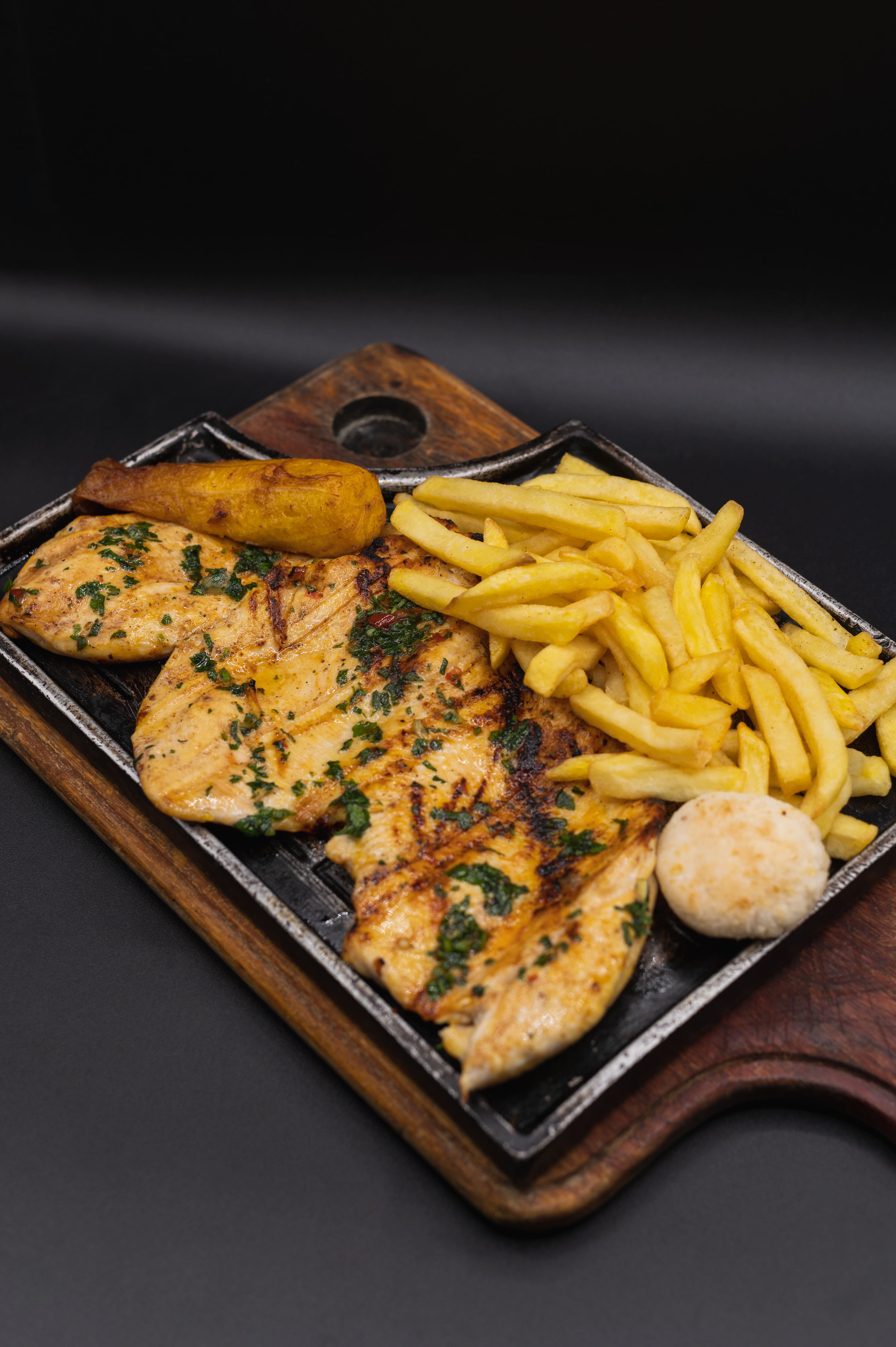 Filete de pollo 200 g acompañada de papas a la francesa o arroz, ensalada, maduro, arepa y frijoles como principio más agua de panela.