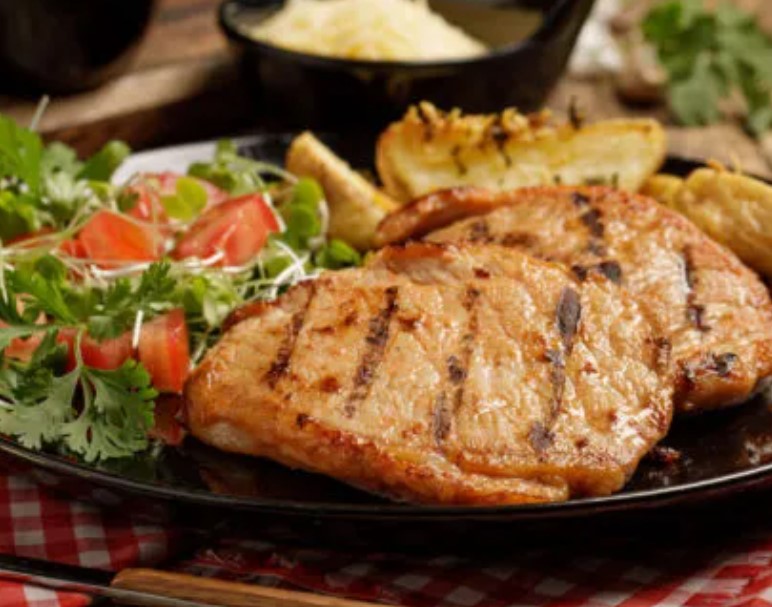 Lomo de cerdo 200 g acompañada de papa a la francesa o arroz, ensalada, maduro, arepa y frijoles como principio más agua de panela.