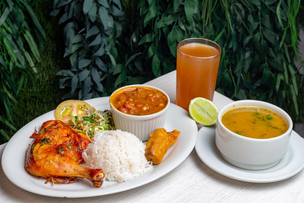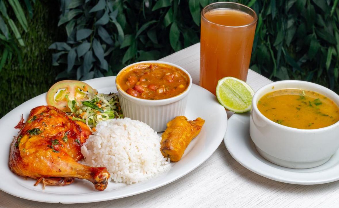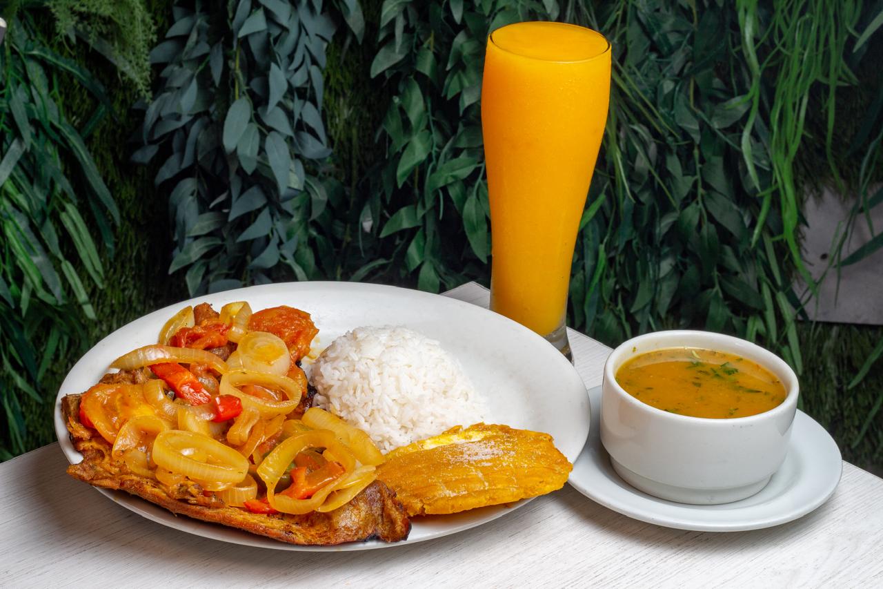 Almuerzo ejecutivo incluye proteina a eleccion, arroz, maduro, sopa del dia, principio a eleccion y agua de panela