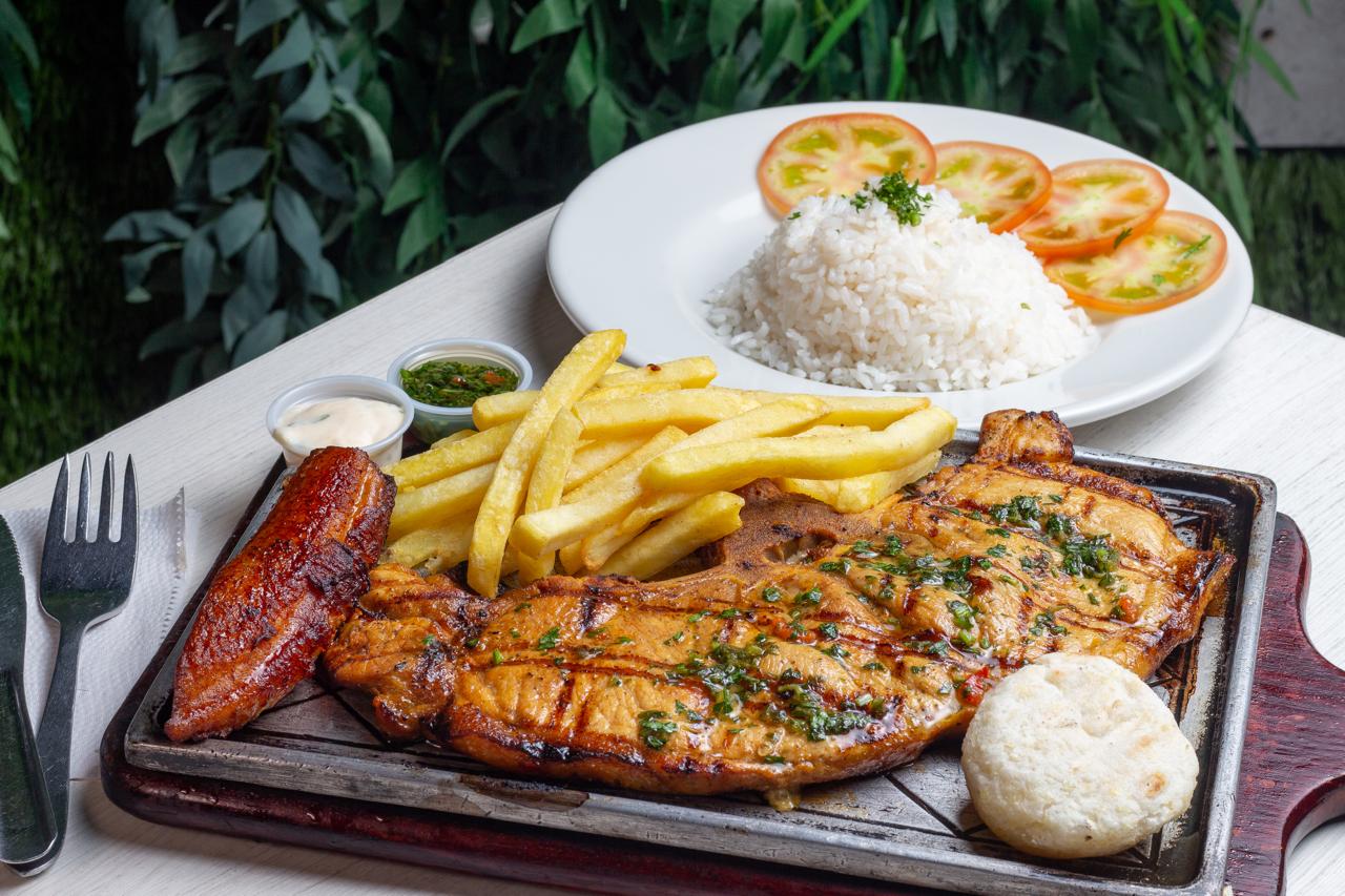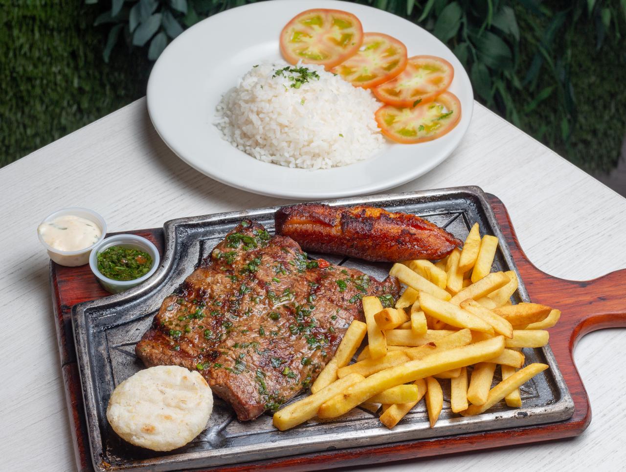 Churrasco de res, con papa francesa, arepa, maduro arroz y ensalada de la casa.