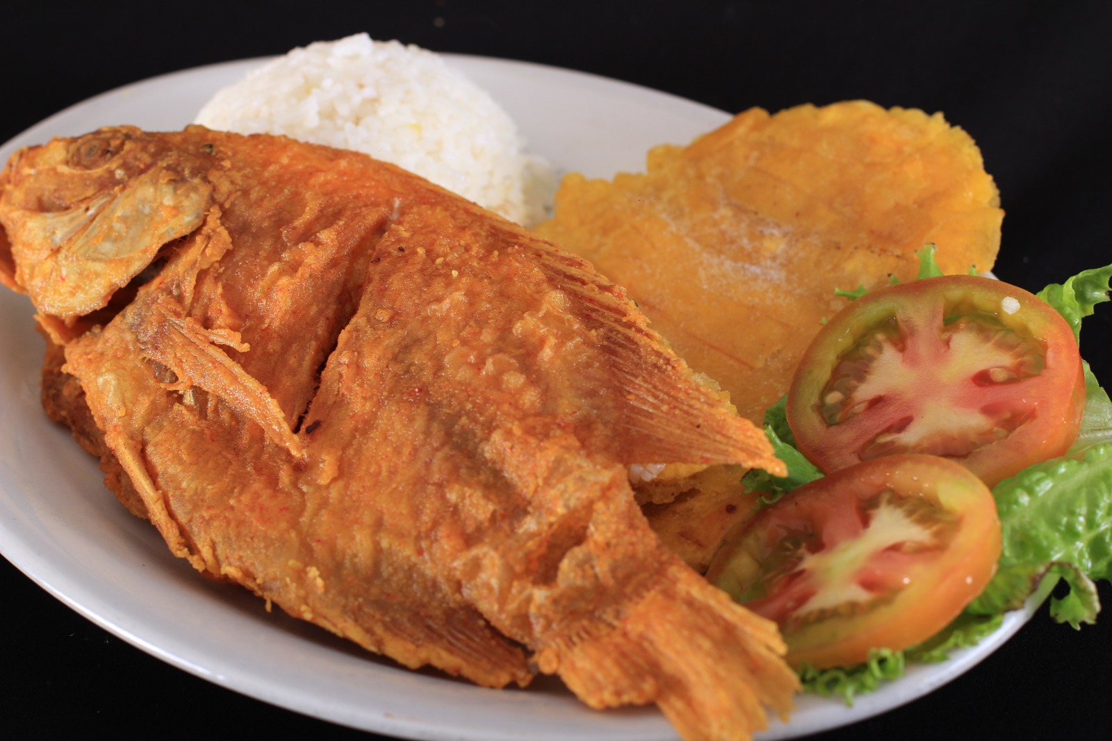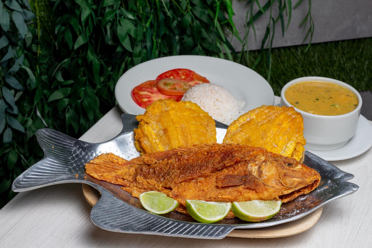Tilapia frita, acompañada de arroz, tostadas de plátano y sancocho pescado.