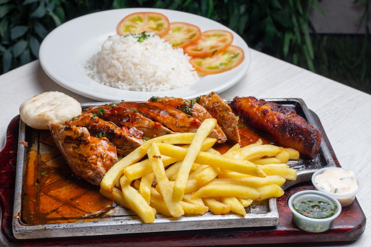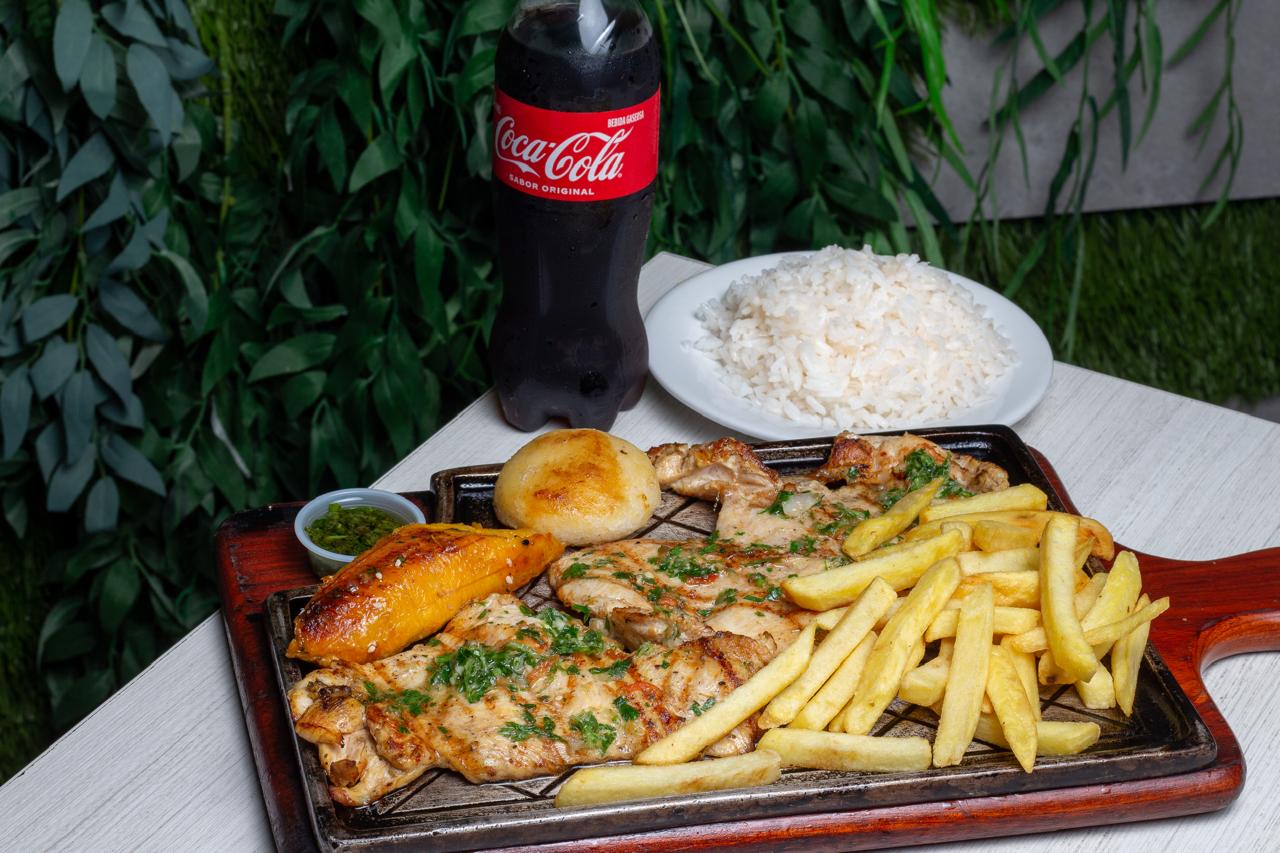 2 filetes de pollo + 2 carnes + 2 lomo cerdo + 4 chorizos + 2 chicharrones + 2 costillas de cerdo + arepa y Moneditas de plátano + limón + aros de cebolla y una gaseosa litro y medio.