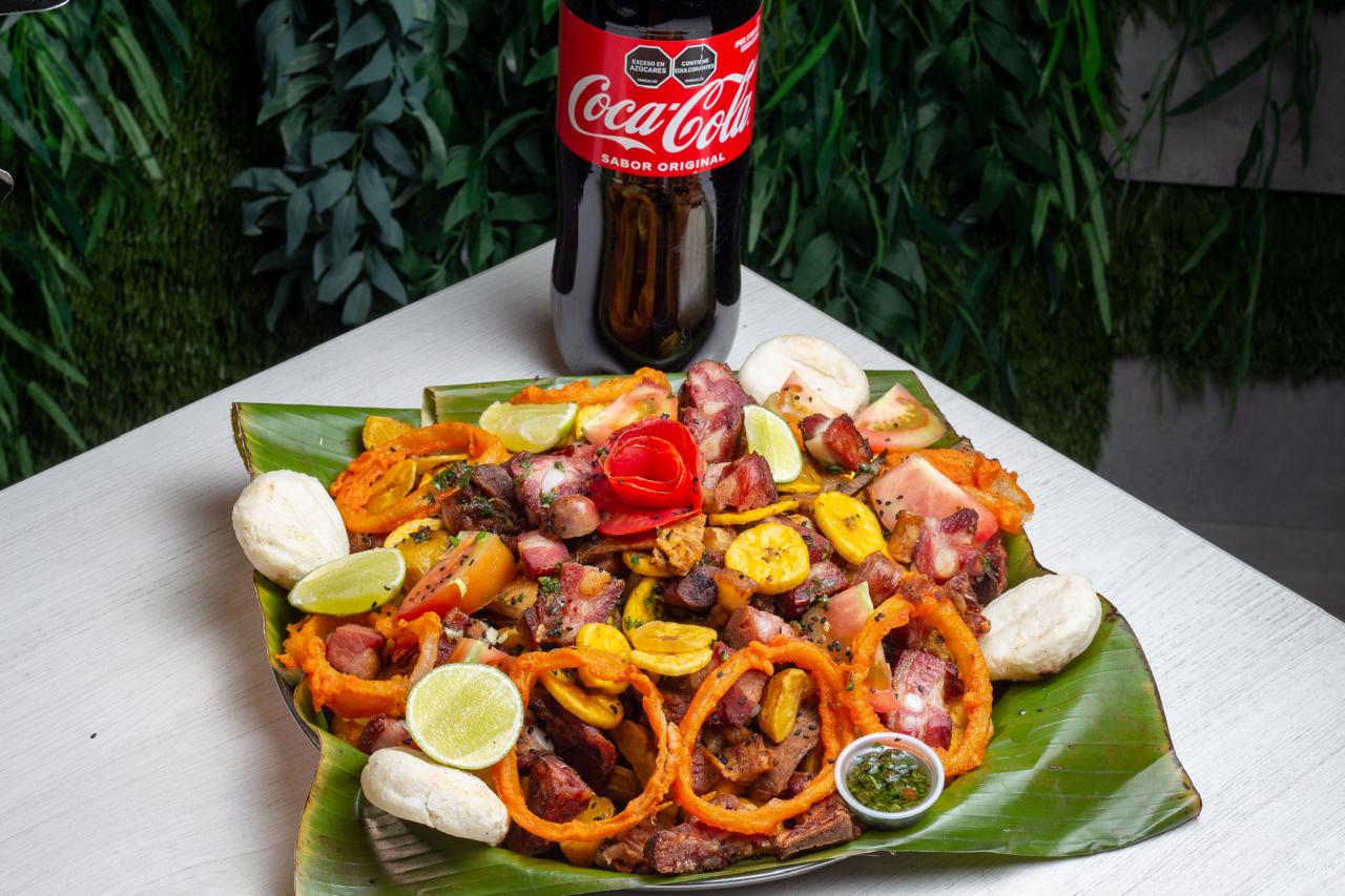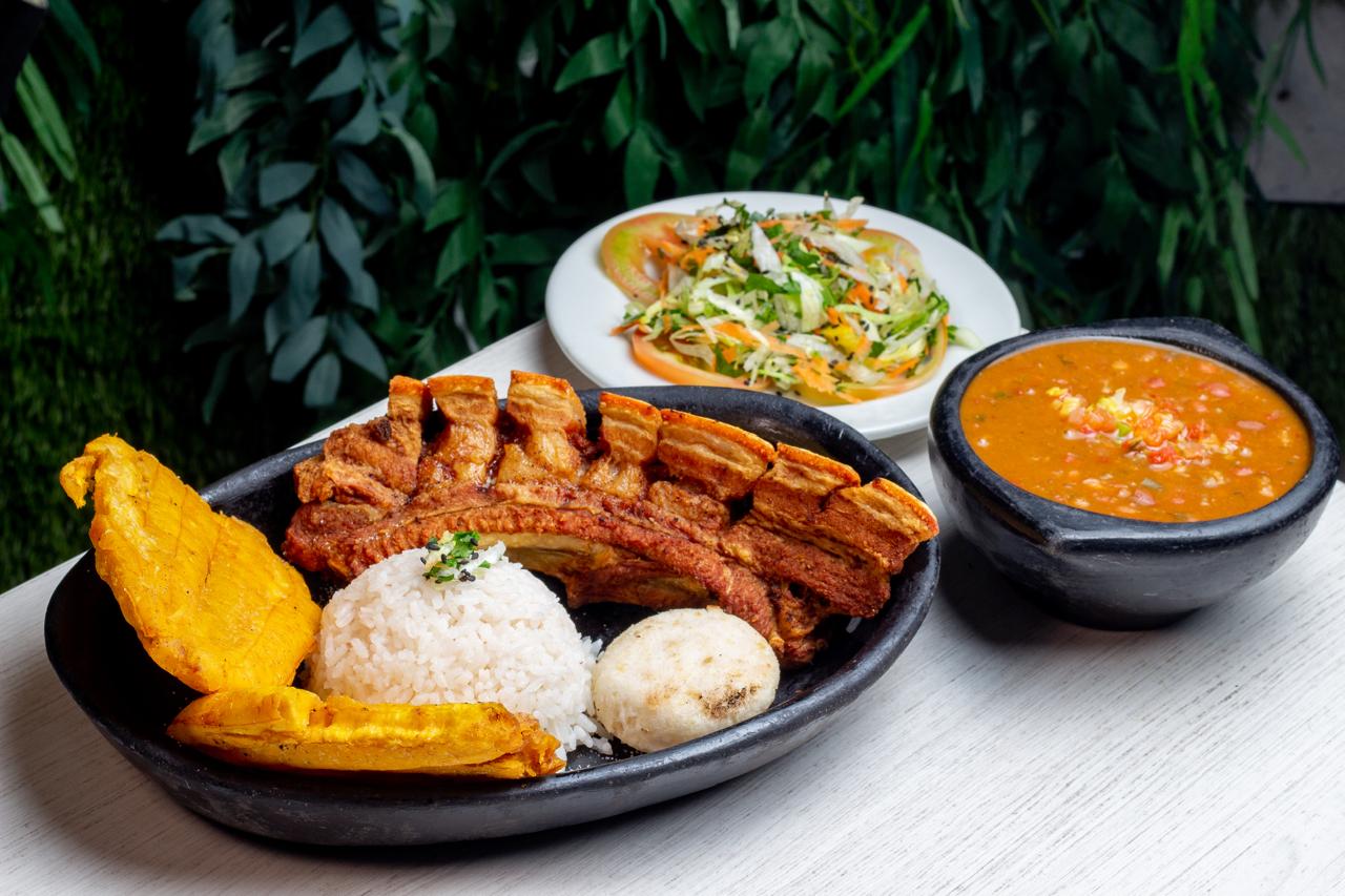 Costilla de cerdo frita picada en cuadros, pico de gallo chips de plátano + porción de frijol con porción de arroz y arepa.