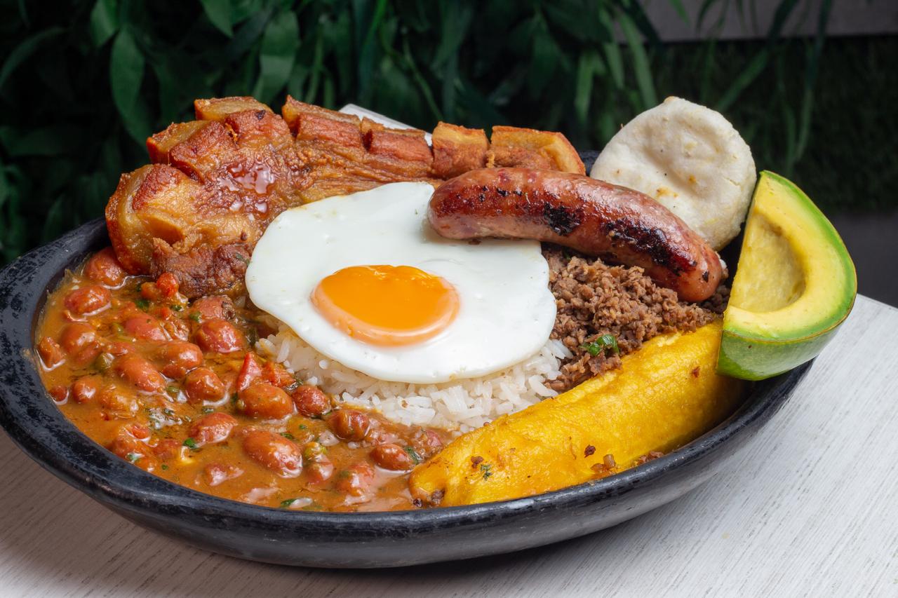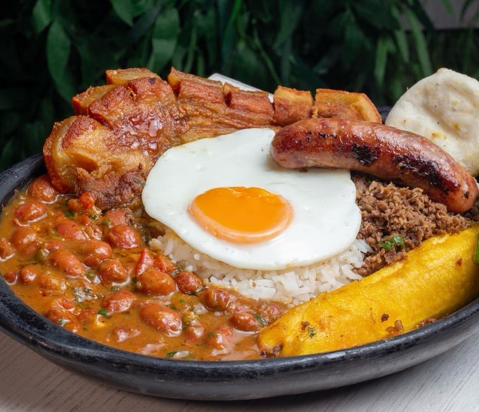 Frijoles con arroz, carne molida, chicharrón, huevo, chorizo, arepa, maduro + bebida