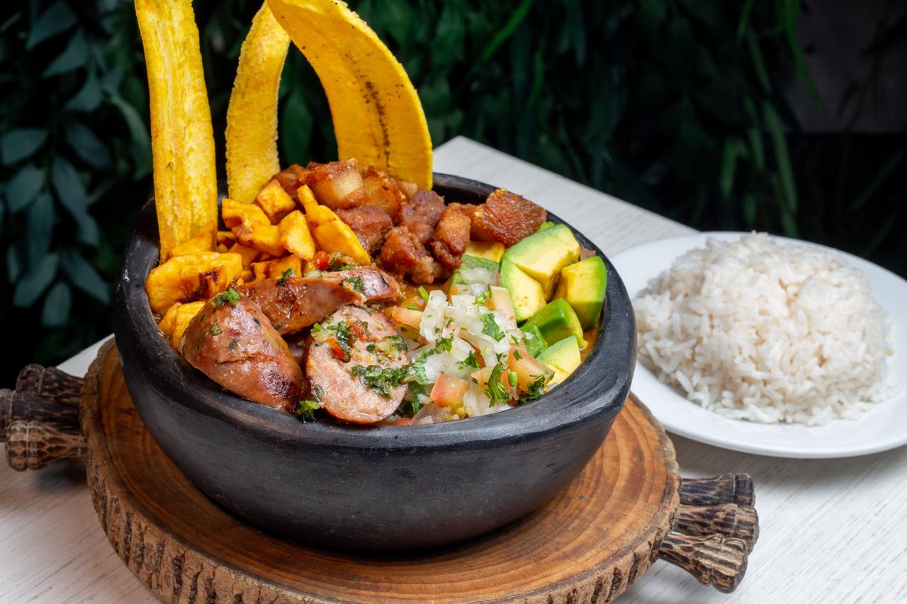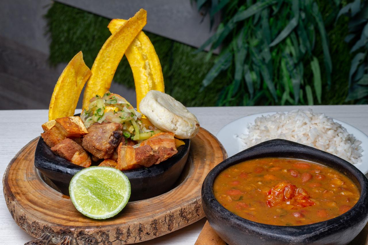 frijoles, chorizo, chicharron, maduro en cuadritos, aguacate en cuadritos, pico de gallo, porcion de arroz y chips de platanos