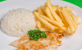 Filete de pollo con papa francesa, arroz y sopa del dia