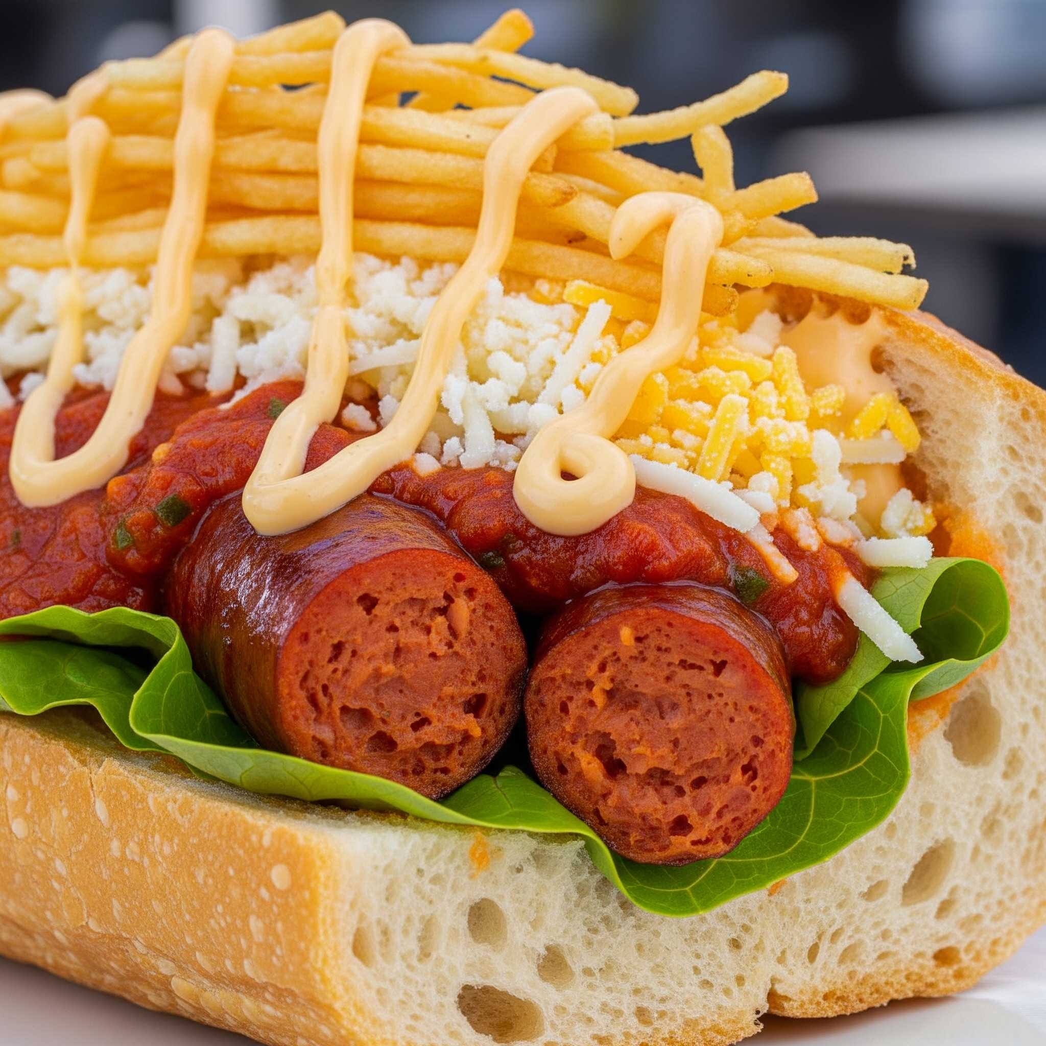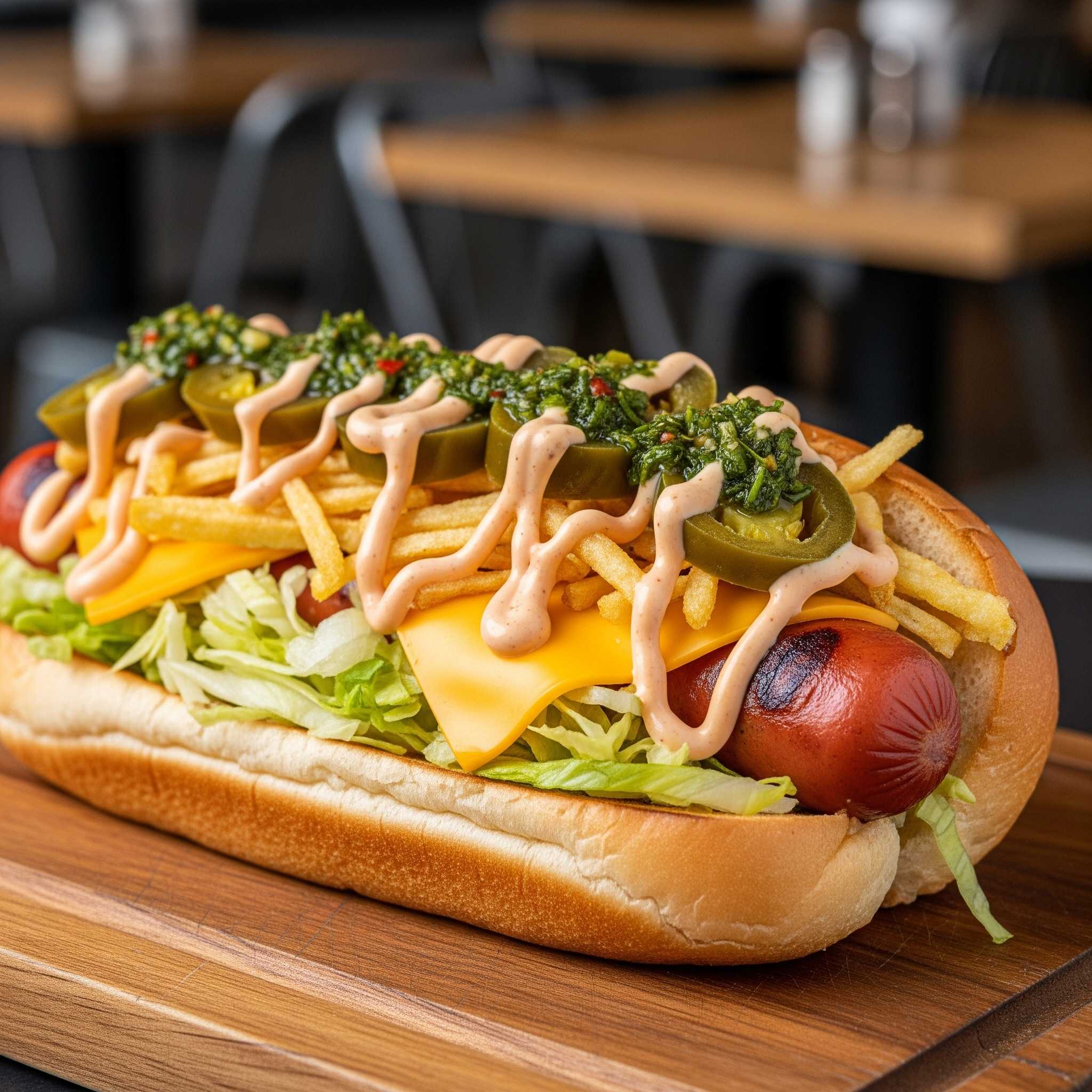 Lechuga, ripio, salsa de la casa, salchicha americana, jalapeños, queso y chimichurri.