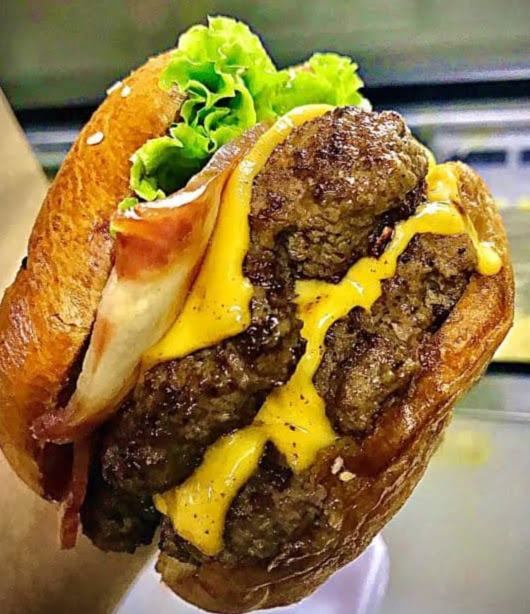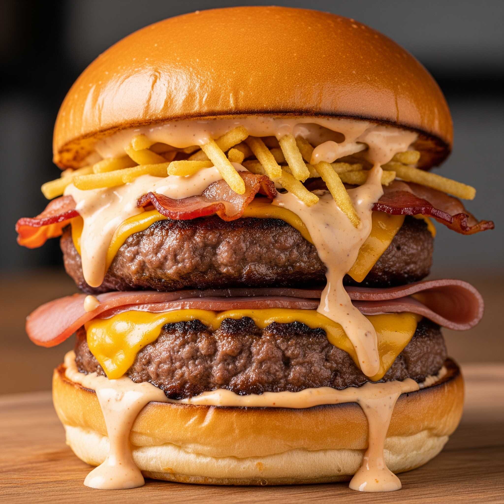 Doble carne Angus, doble queso cheddar, cebolla morada, doble tocineta, papas en cascos y salsa de la casa.