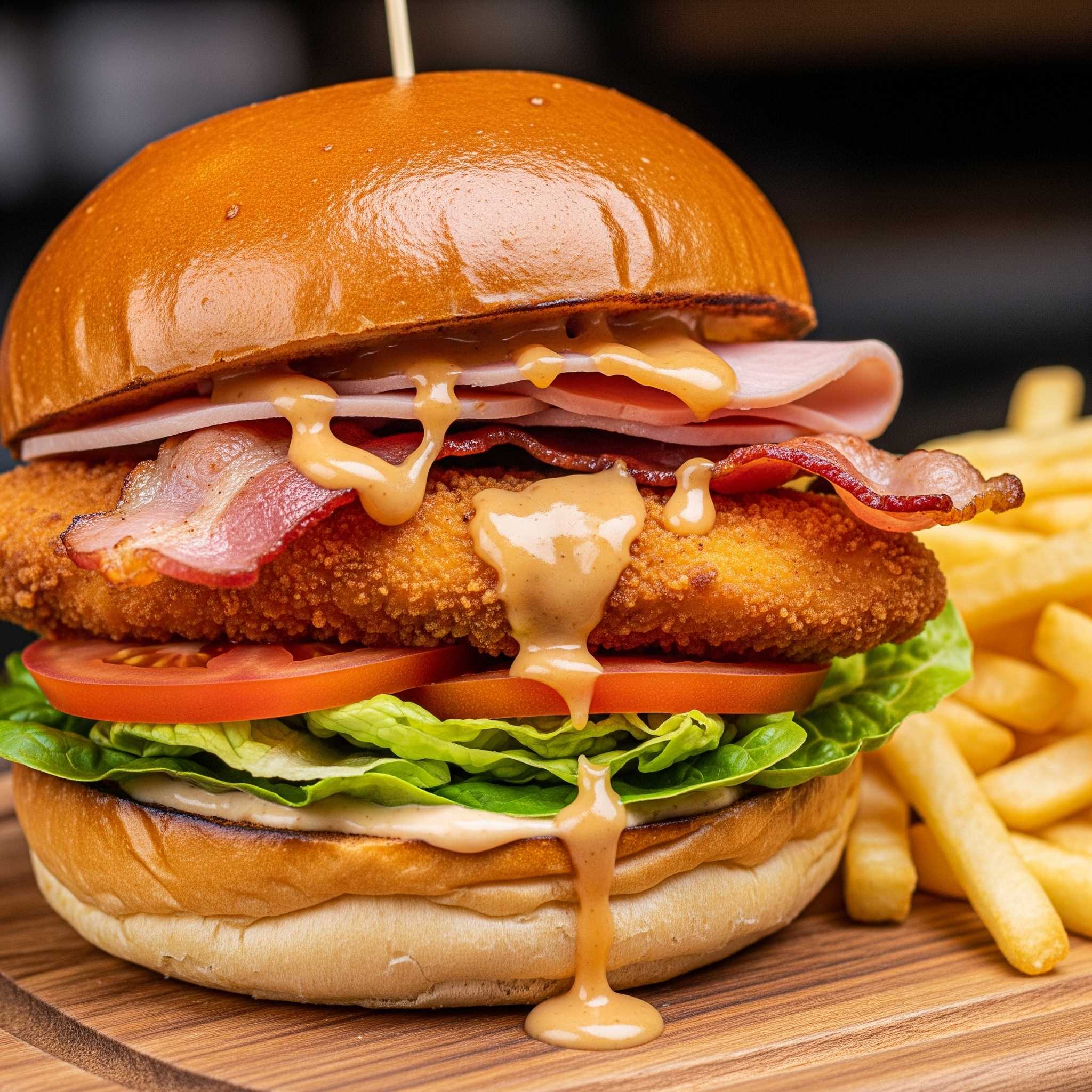 Pan brioche, ripio, lechuga, tomate, filete de pollo, tocineta, jamón y salsa de la casa.