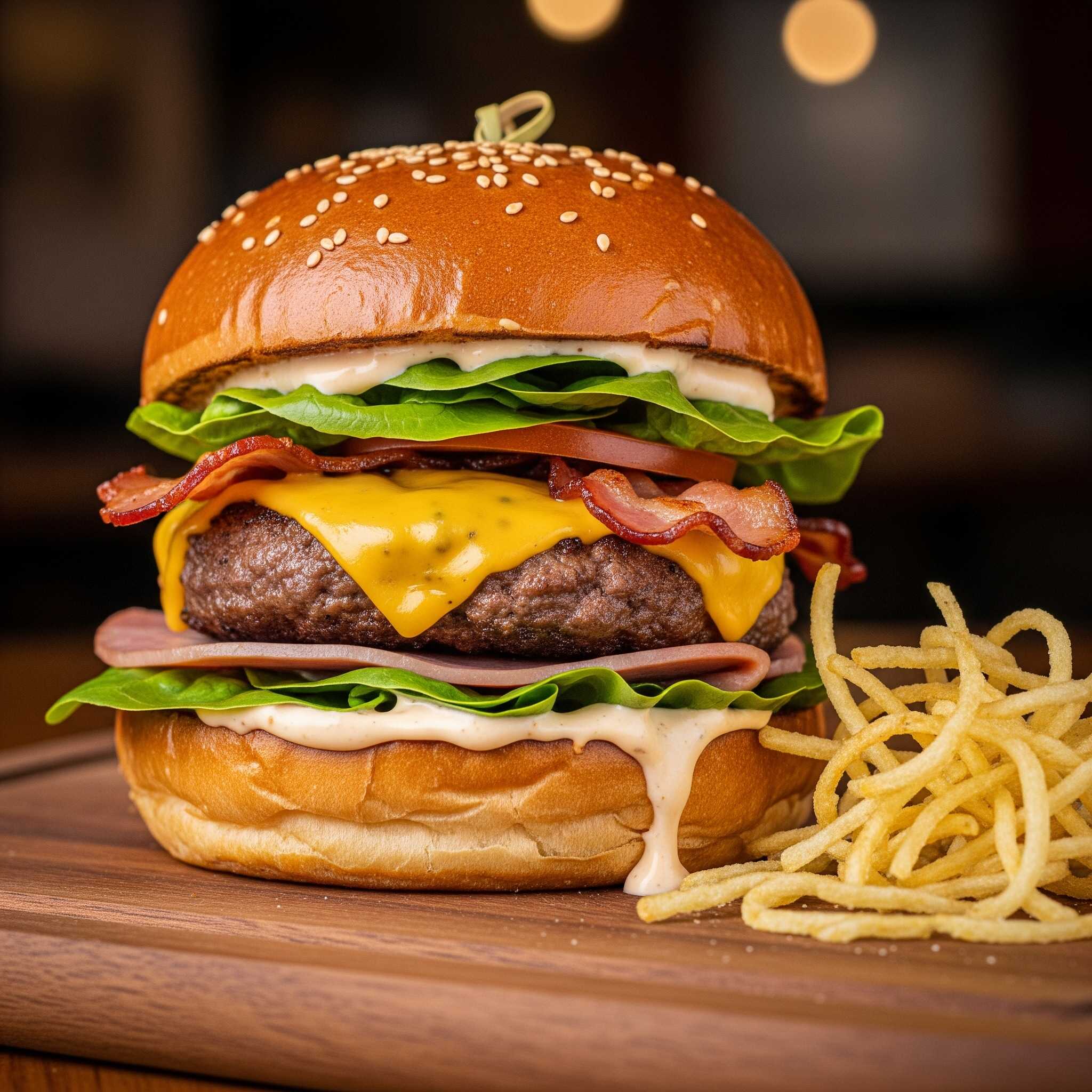 Doble carne artesanal, pan brioche, queso, tocineta, jamón, ripio y salsa de la casa.