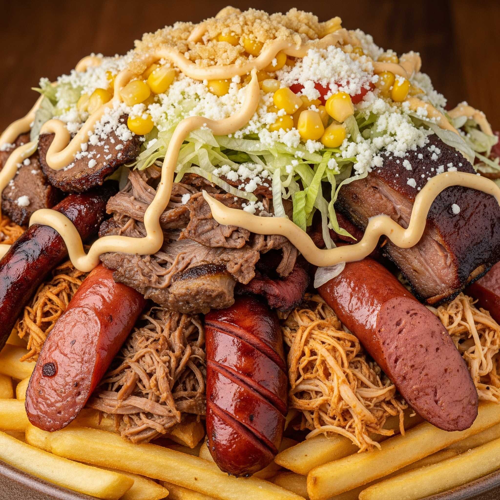 Carne, pollo, maíz dulce, salsa de la casa, queso, ripio y tocineta