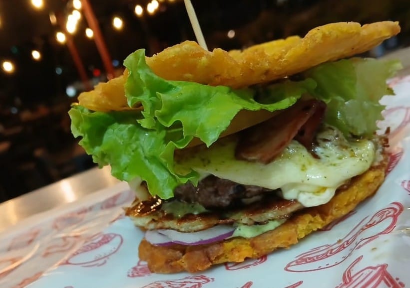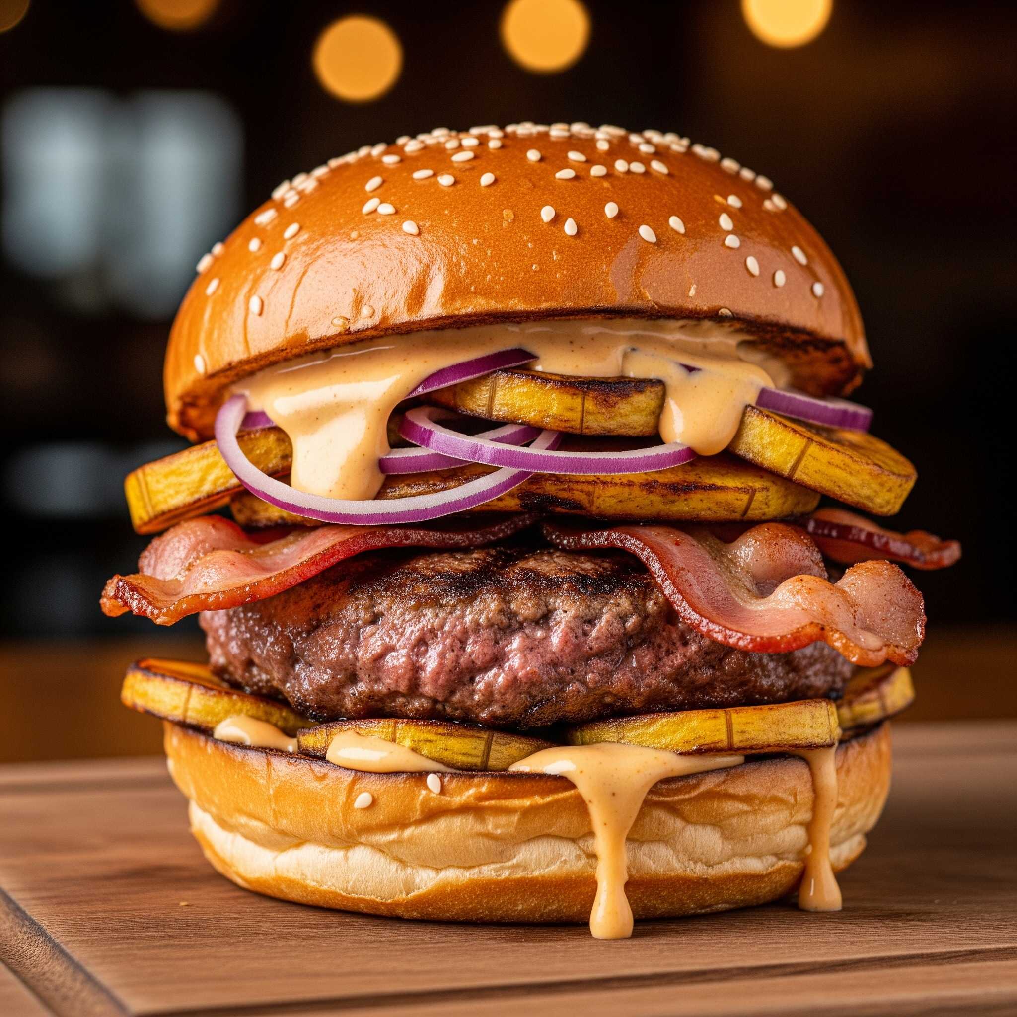 Pan, carne Angus, delicioso maduro calado, tocineta, cebolla morada y salsa de la casa.