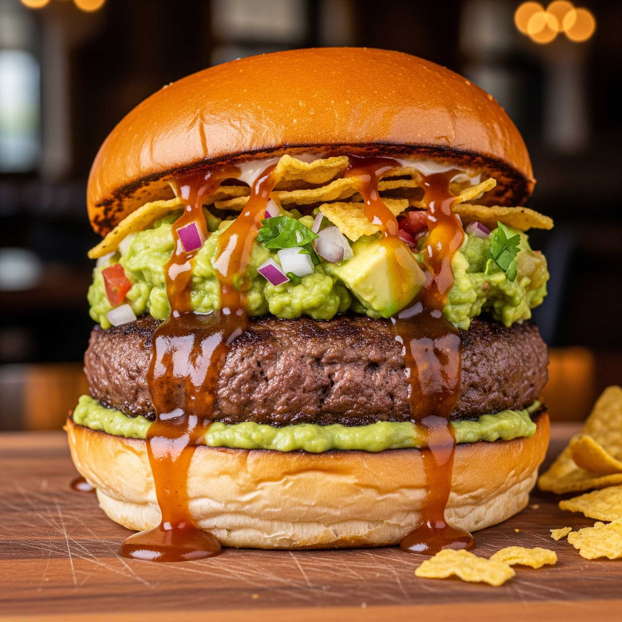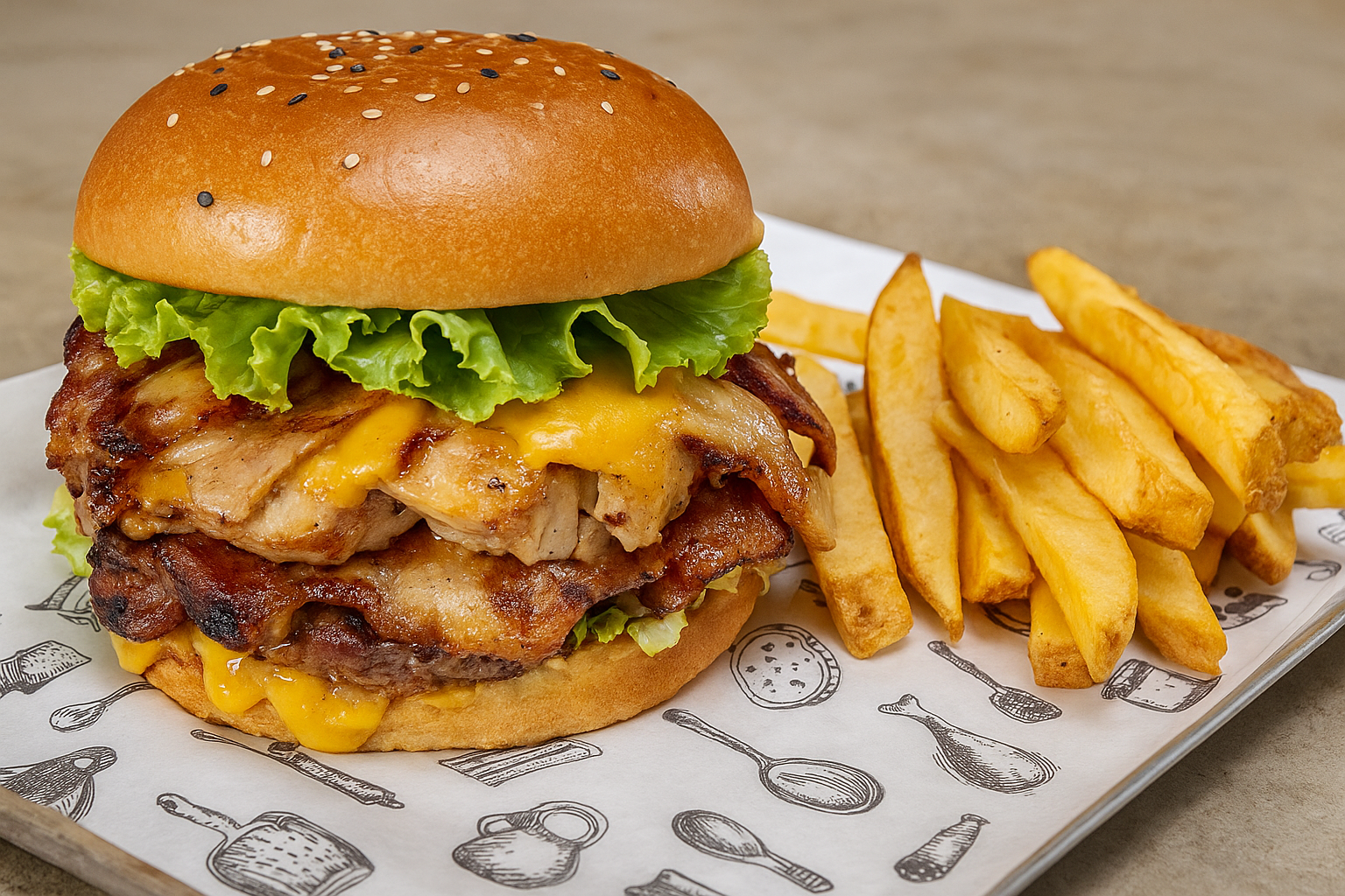 Carne Angus, filete de pollo, doble queso cheddar, doble tocineta, cebolla morada, papas en cascos y salsa de la casa.