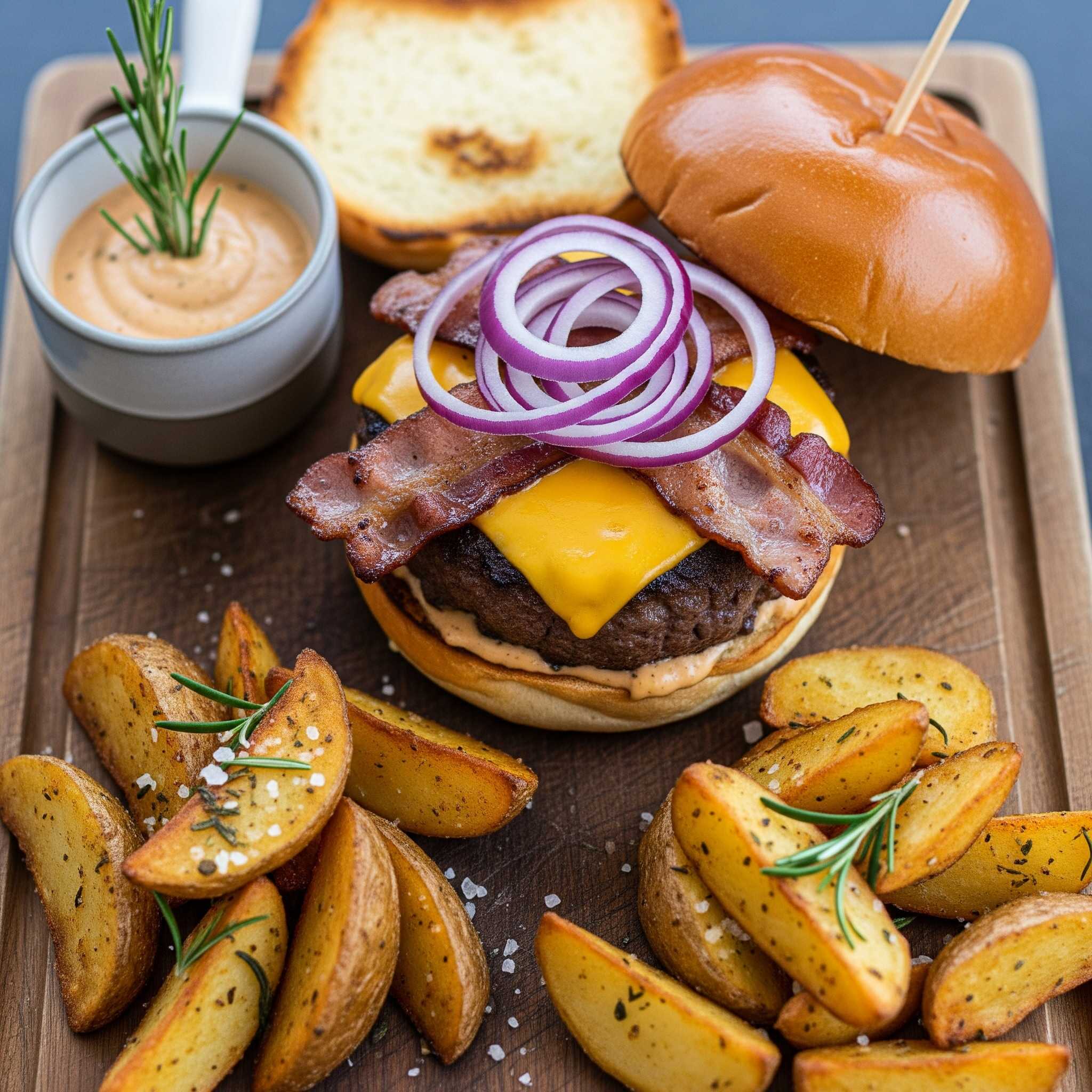Carne Angus, queso cheddar, cebolla morada, papas en cascos, tocineta, pan y salsa de la casa.