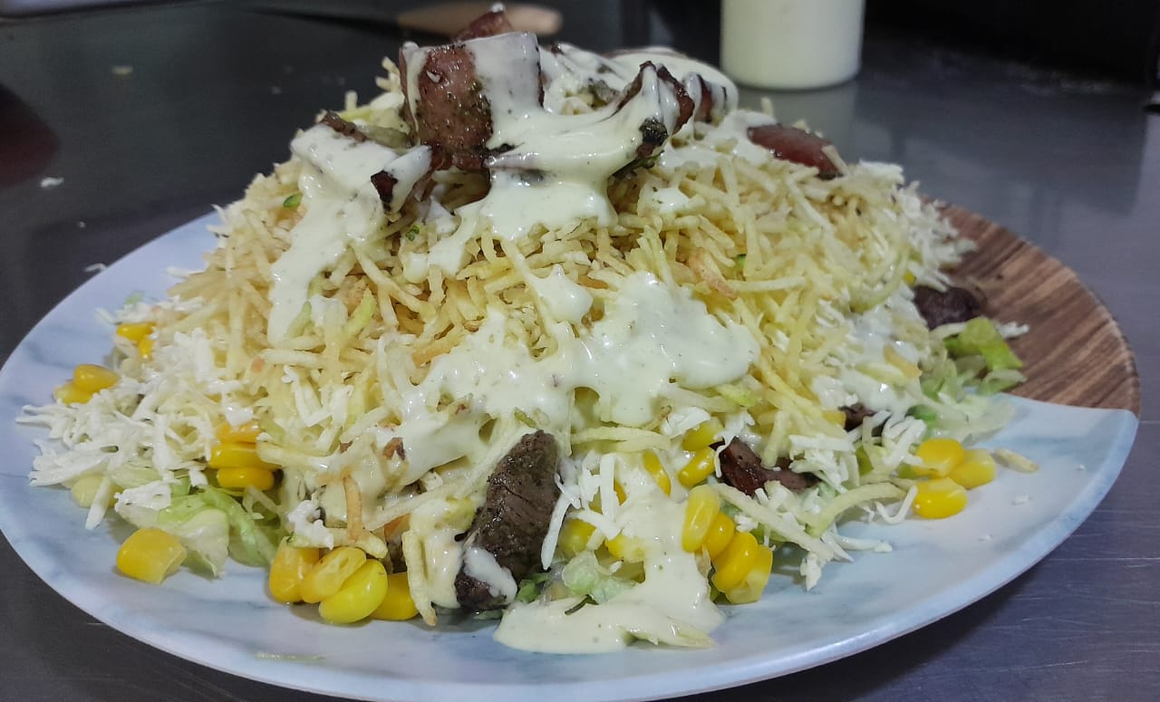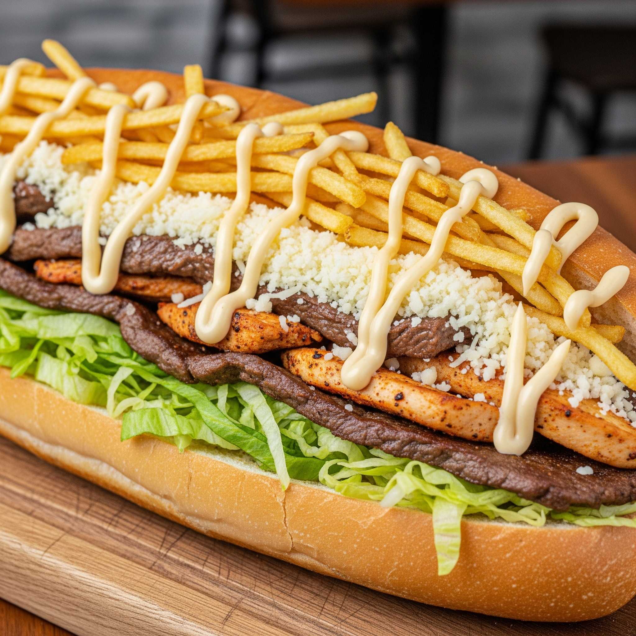 Carne artesanal, filete de pollo, mucho queso, lechuga, tomate, tocineta, ripio y salsa de la casa.
