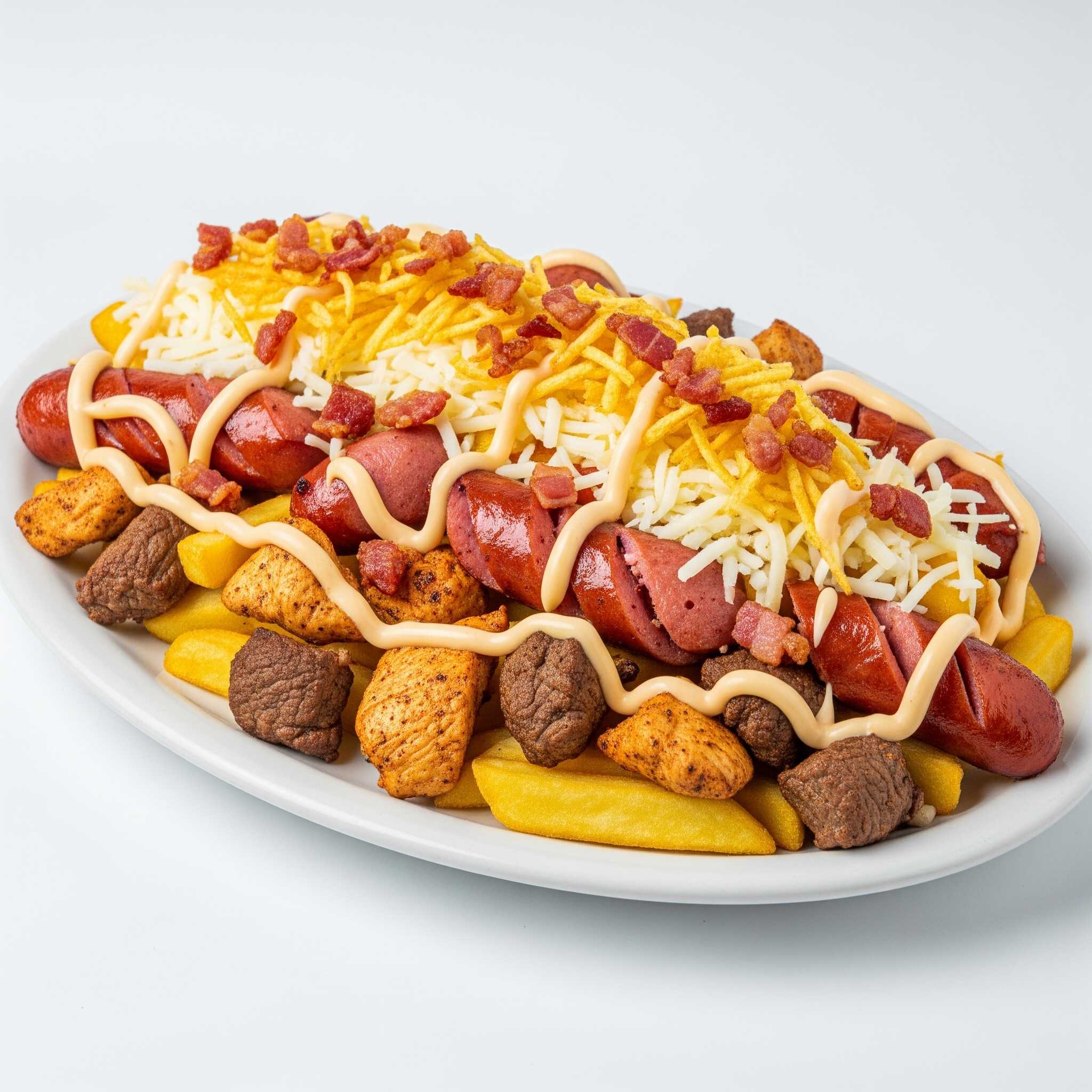 Papa amarilla, salchicha risch, res, pollo, salsa de la casa, queso rallado, ripio y tocineta.
