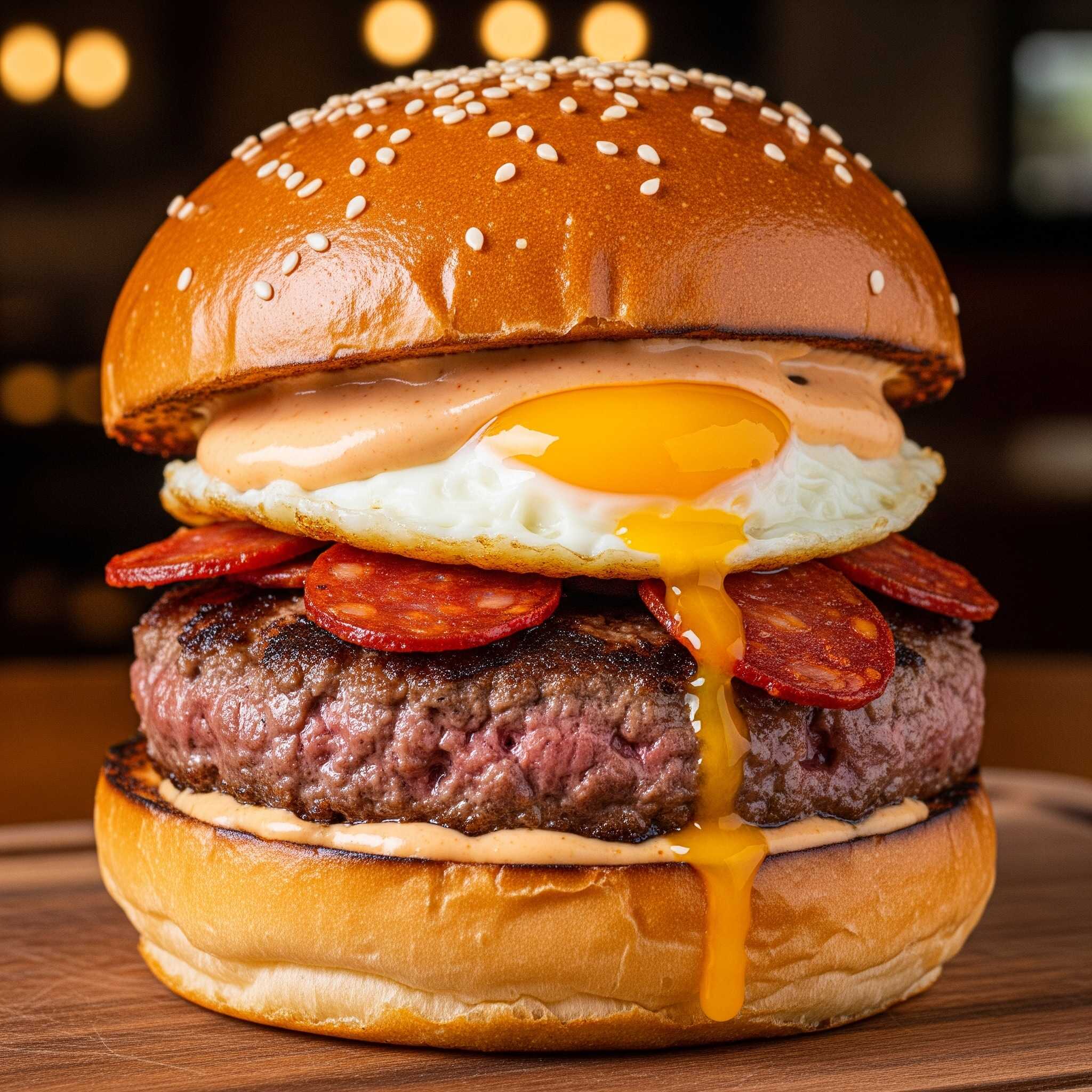 Pan, carne Angus, huevo frito, chorizo santarosano y salsa de la casa.
