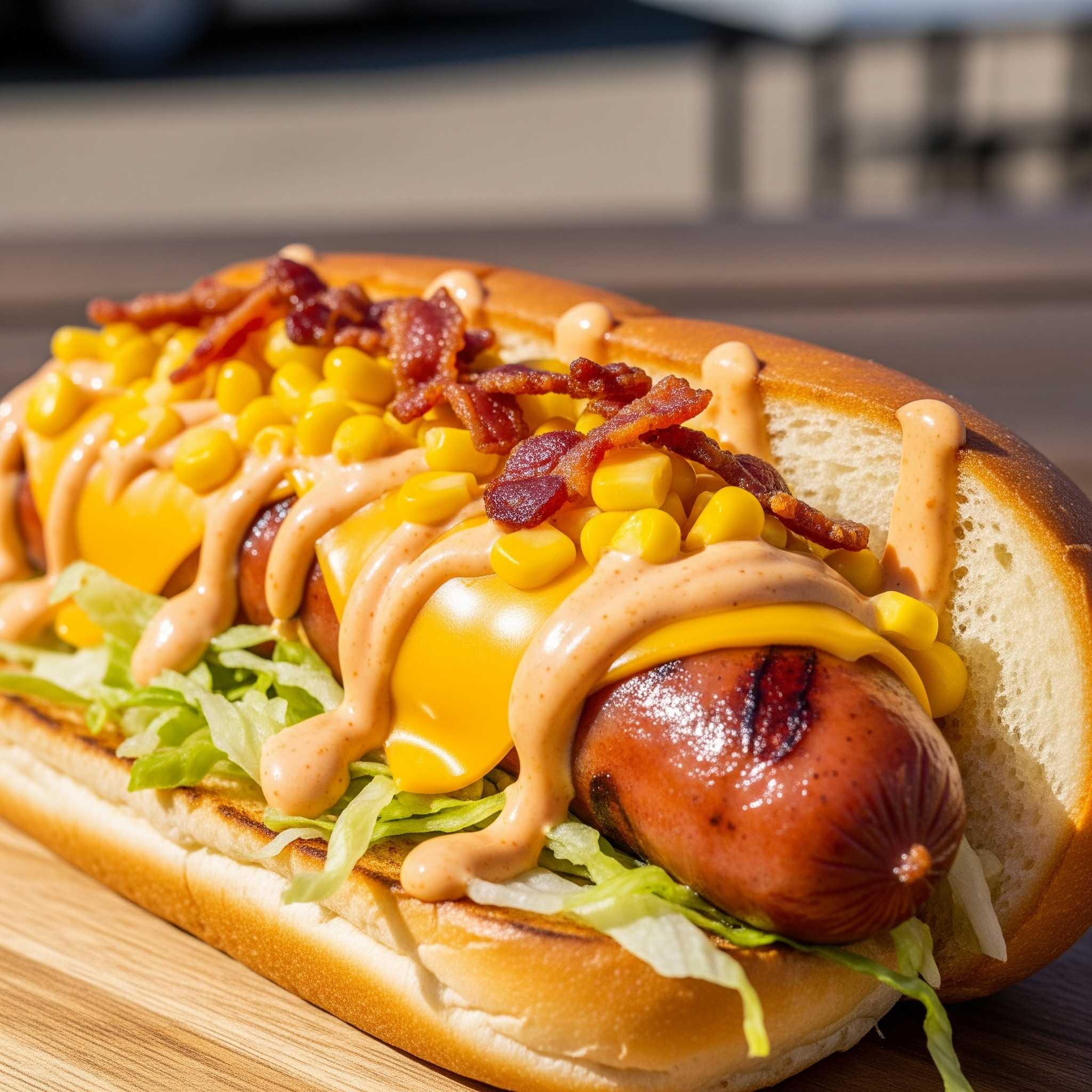 Lechuga, salsa de la casa, salchicha americana, queso fundido, maíz y tocineta.