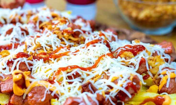 Papa amarilla, salchicha risch, maduro calado, piña en trozos, salsa de la casa y queso rallado.