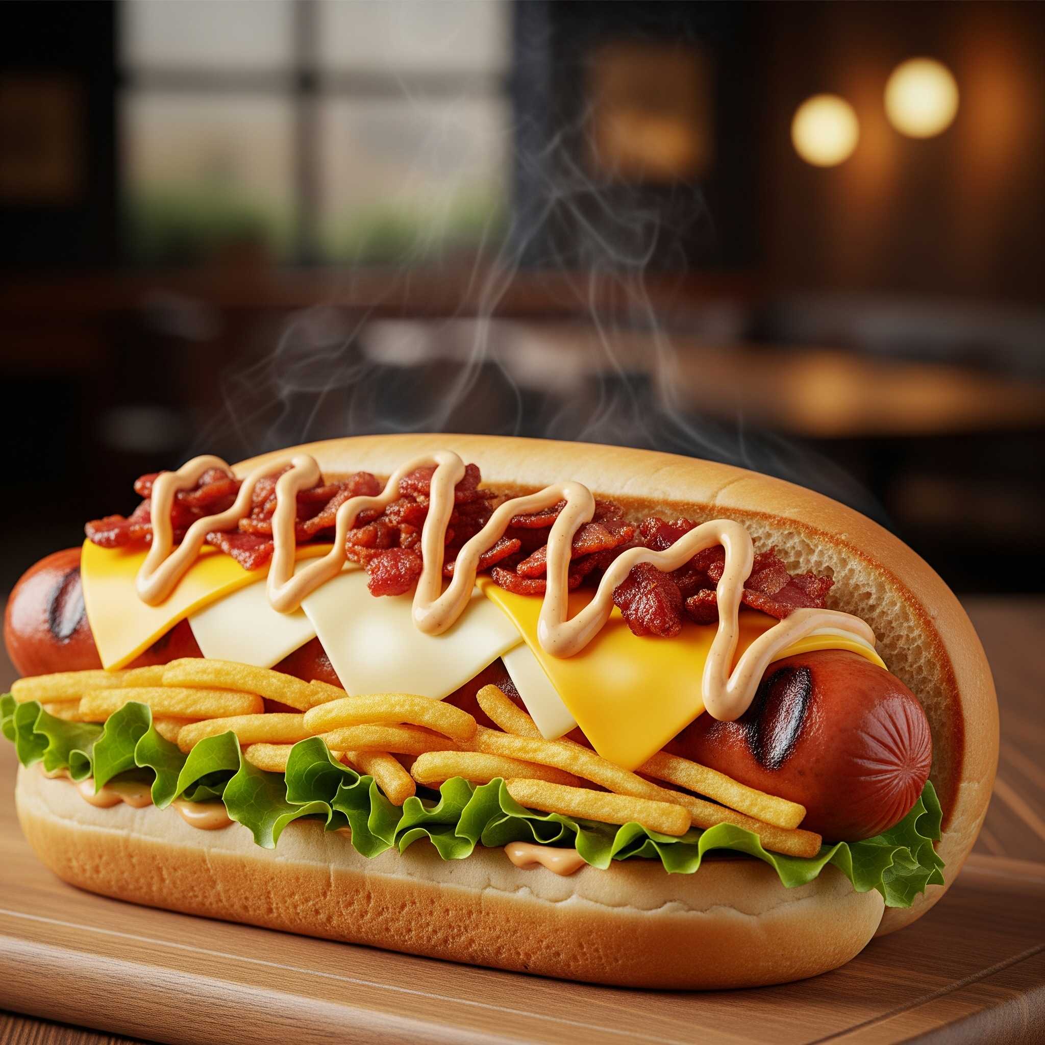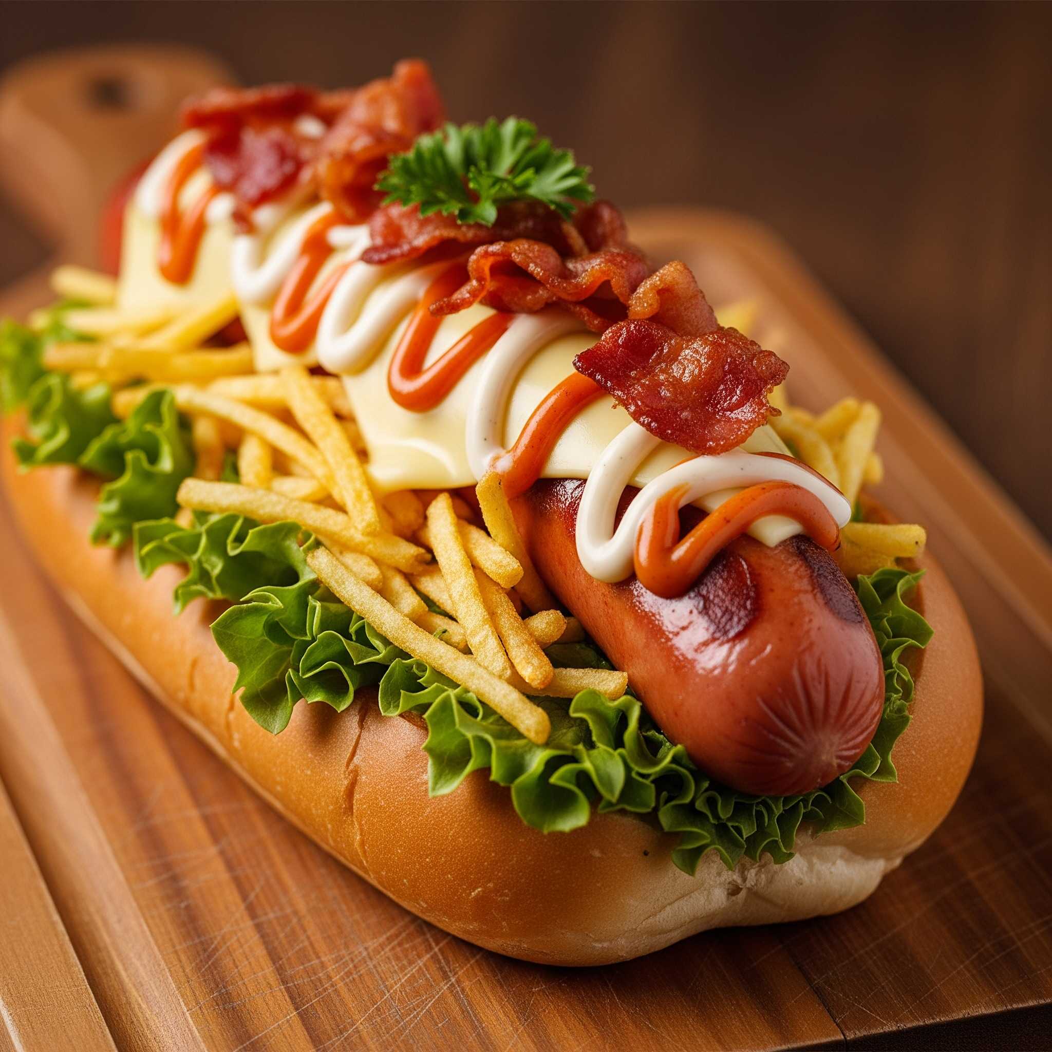 Dos salchichas tipo ranchera, lechuga, queso, ripio, salsa de la casa y tocineta.