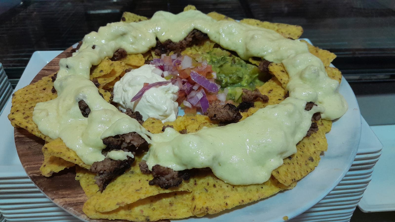 Nachos con carne angus, sawer creen, guacamole, pico e'gallo y queso fundido