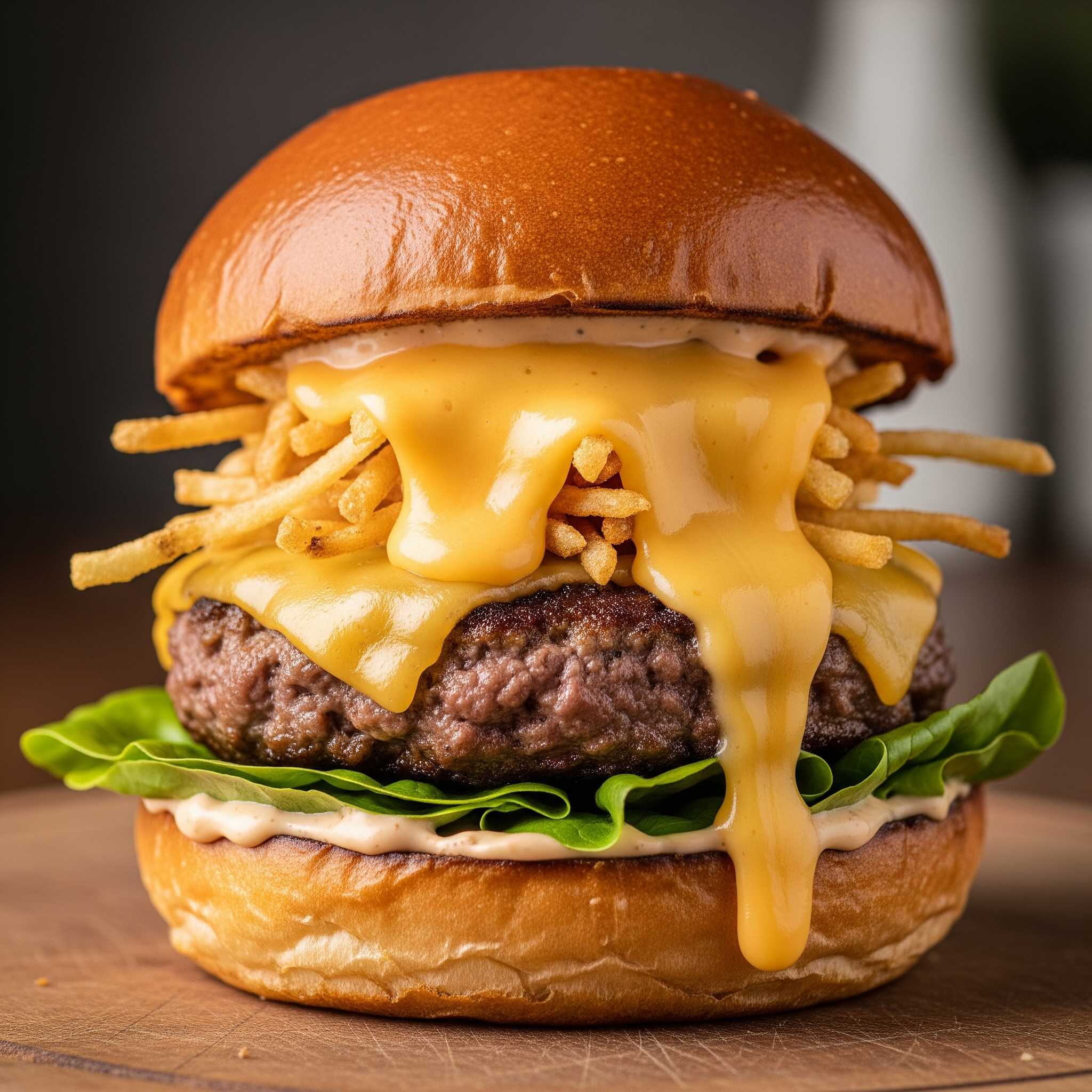 Carne artesanal, pan brioche, lechuga, ripio, salsa de la casa y mucho queso fundido.