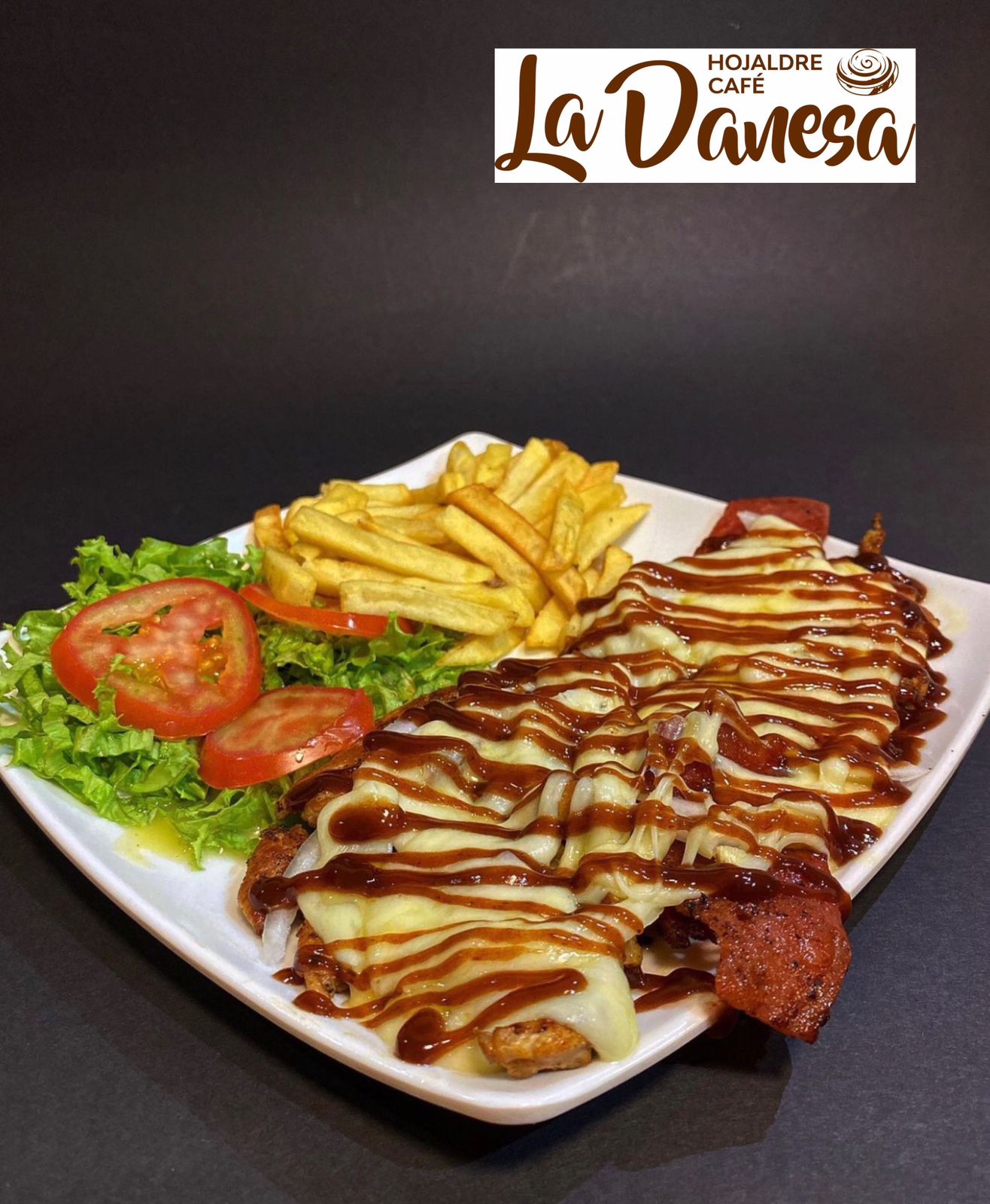 PAN TAJADO, POLLO, TOCINETA, HUEVO FRITO, QUESO, LECHUGA, TOMATE Y RIPIO DE PAPA, SALSA TARTARA, SALSA BBQ