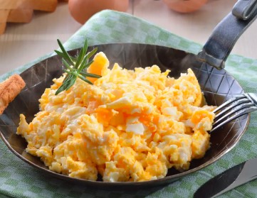 Huevos ligeramente batidos, mantequilla y sal al gusto. Acompañado de porción de arroz, arepa sin sal y juguito del día