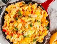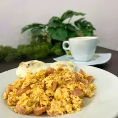 Huevos revueltos, con cebolla, tomate, salchicha Ranchera en trozos pequeños, mantequilla y sal al gusto, acompañado de porción de arroz, arepa sin sal y juguito del día