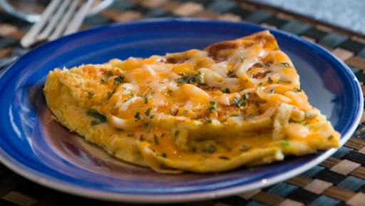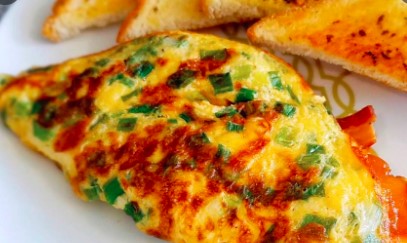 Tortilla de 2 huevos, cebolla, tomate, queso doble crema, pollo desmechado y tocineta, mantequilla y sal al gusto. Acompañado de pan tajado. Platillo personal