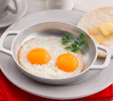 2 Unidades huevos freidos en mantequilla, sal al gusto. Acompañado de porción de arroz, arepa sin sal y juguito del día