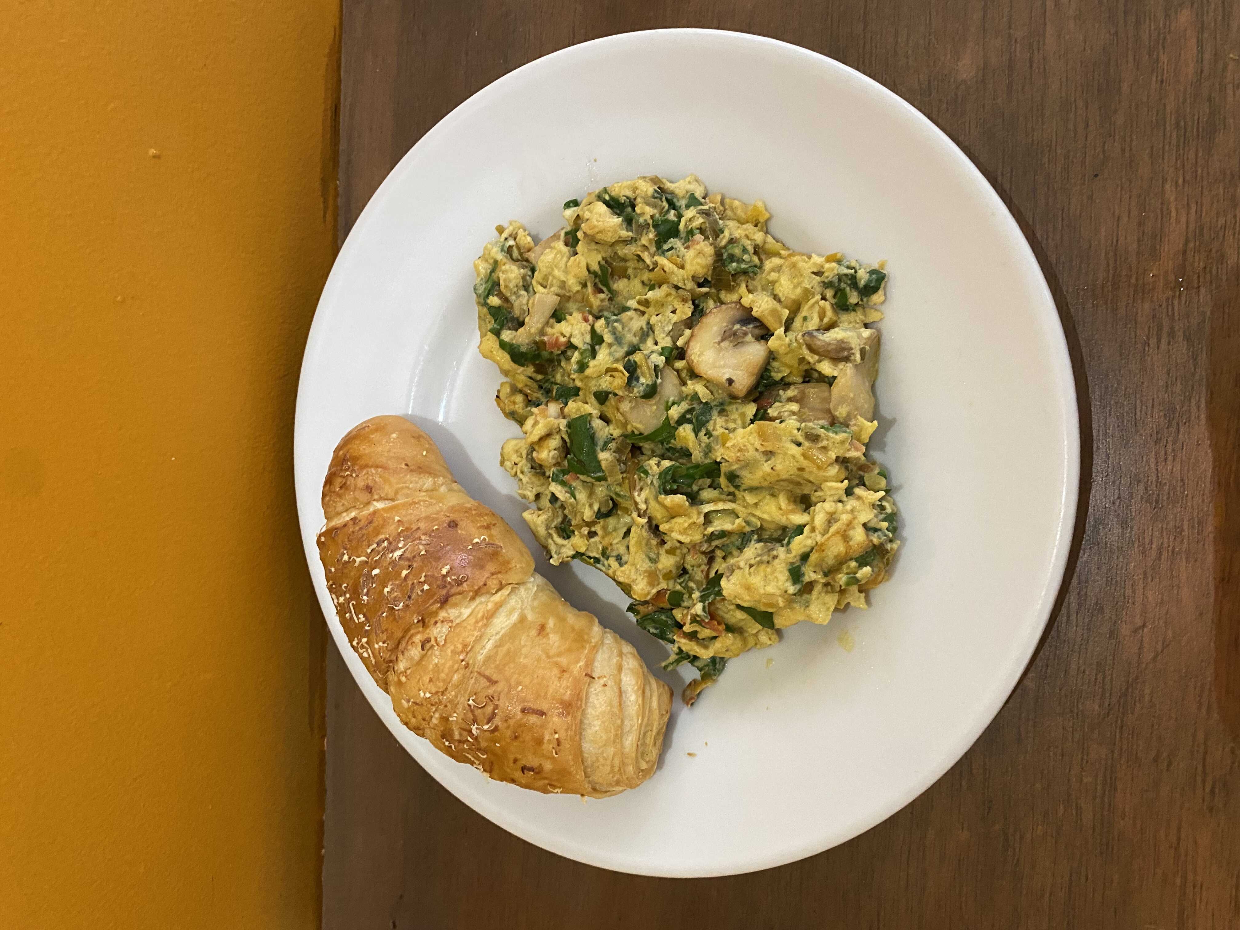 Escoge huevos pericos o huevos revueltos y combínalos con 2 ingredientes acompañados con pan croissant