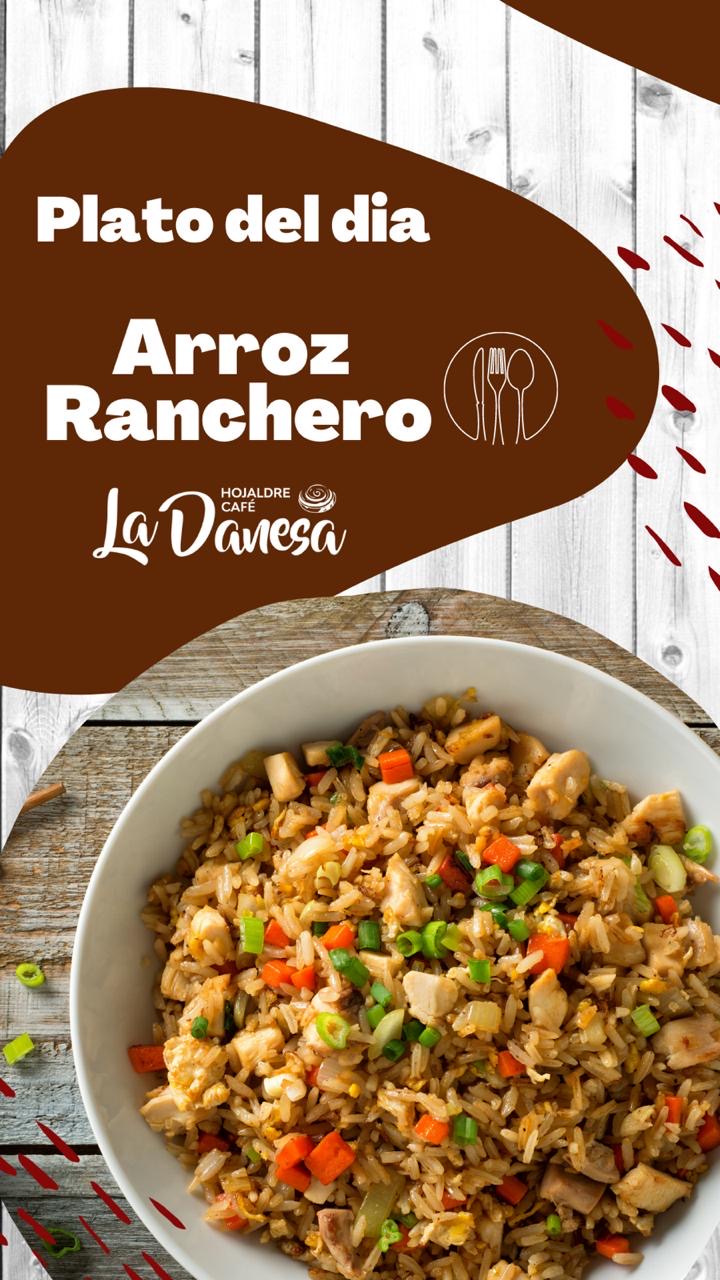 Huevo Rancheros*1 Deliciosos huevos revueltos, con cebolla, tomate, salchicha Ranchera en trozos pequeños, mantequilla y sal al gusto, acompañado de porción de arroz y arepa sin sal. + Café a elección*1