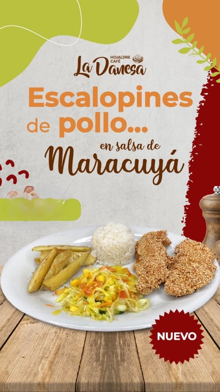 Pechuga de pollo recubierta con ajonjolí bañada en salsa de maracuyá acompañada de arroz, ensalada, papa a la francesa, consomé, jugo del dia