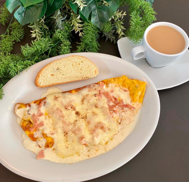 Tortilla de 2 huevos, queso doble crema, jamón, piña, mantequilla y sal al gusto. Acompañado de café en leche o café negro de 9 oz a elección, pan tajado o finas hierbas.