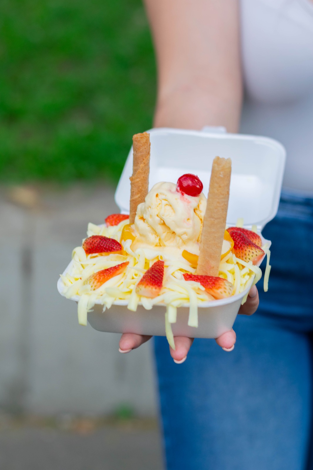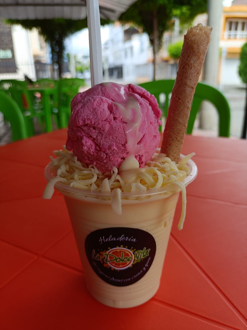 Deliciosa crema de la casa papaya, banano, piña, mango, queso de la casa, bolá de helado adornado con fresas.