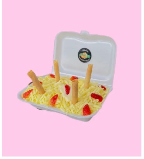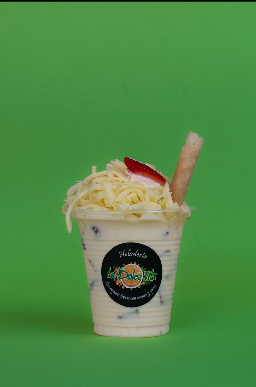 fresas con crema de la casa y queso de la casa en vaso de 30 oz