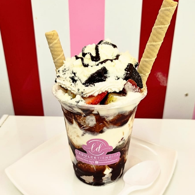 Dos Planchas de suspiros crujientes con capas de suave crema chantilly, combinadas con 3 frutas a elección, 2 salsas irresistibles y 2 toppings para darle el toque final perfecto.